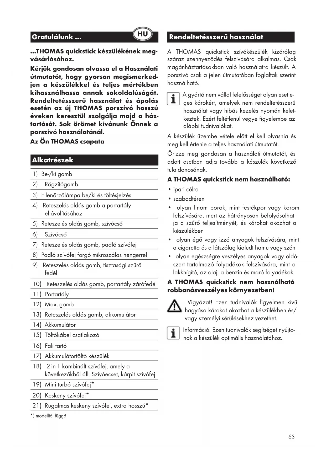 - olyan egészségre veszélyes anyagok vagy oldó- szert tartalmazó folyadékok felszívására, mint a lakkhígító, az olaj, a benzin és maró folyadékok A THOMAS quickstick nem használható robbanásveszélyes környezetben! Vigyázat! Ezen tudnivalók figyelmen kívül hagyása károkat okozhat a készülékben és/ vagy személyi sérülésekhez vezethet. Információ. Ezen tudnivalók segítséget nyújta- nak a készülék optimális használatához. HU64 Biztonsági tudnivalók