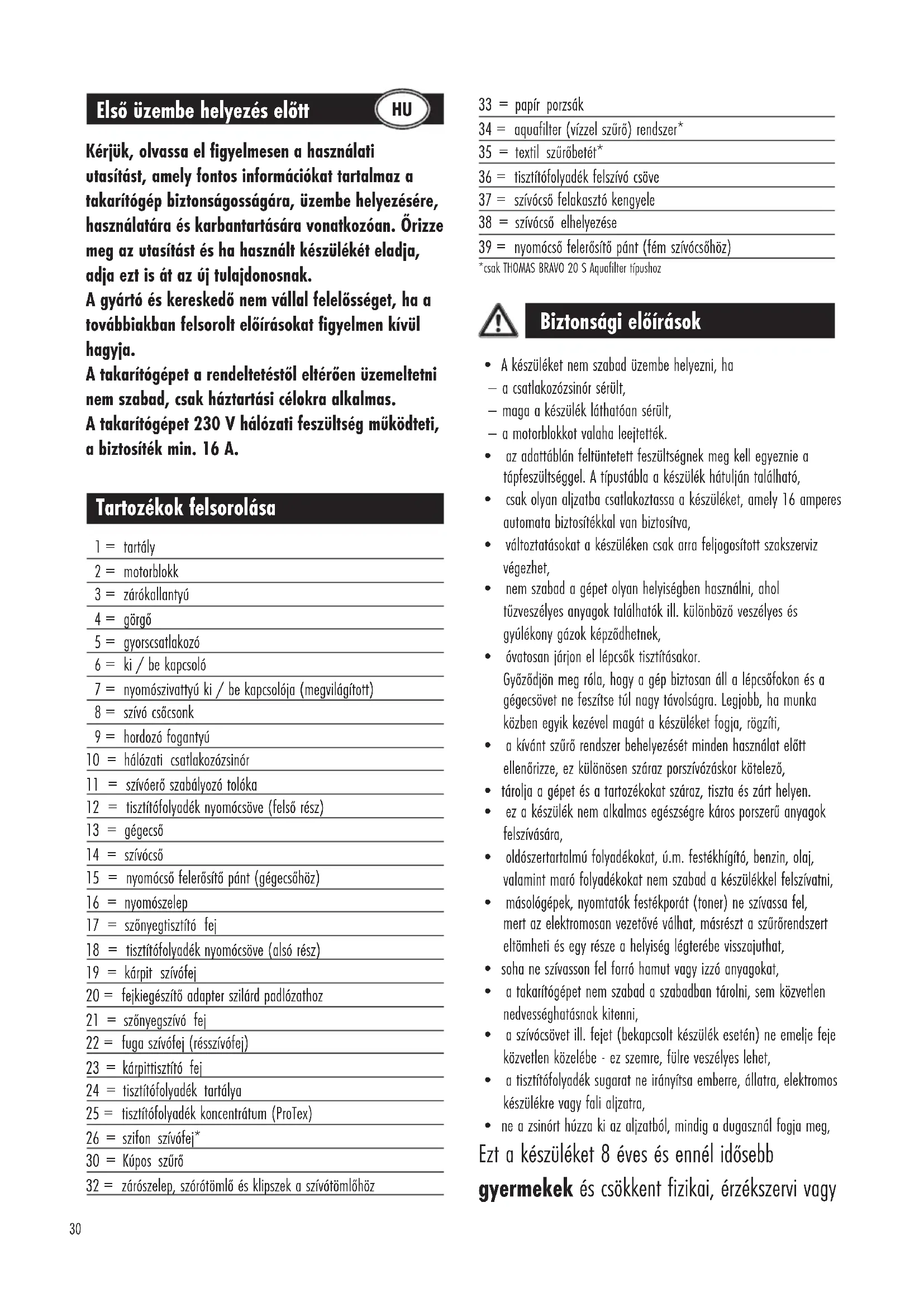 . 7,1 kg Inhoud tank voor schoon water 3,5 l Technische wijzigingen voorbehouden.30 Első üzembe helyezés előtt Kérjük, olvassa el figyelmesen a használati utasítást, amely fontos információkat tartalmaz a takarítógép biztonságosságára, üzembe helyezésére, használatára és karbantartására vonatkozóan. Őrizze meg az utasítást és ha használt készülékét eladja, adja ezt is át az új tulajdonosnak. A gyártó és kereskedő nem vállal felelősséget, ha a továbbiakban felsorolt előírásokat figyelmen kívül hagyja. A takarítógépet a rendeltetéstől eltérően üzemeltetni nem szabad, csak háztartási célokra alkalmas. A takarítógépet 230 V hálózati feszültség működteti, a biztosíték min. 16 A. Tartozékok felsorolása 1 = tartály 2 = motorblokk 3 = zárókallantyú 4 = görgő 5 = gyorscsatlakozó 6 = ki / be kapcsoló 7 = nyomószivattyú ki / be kapcsolója (megvilágított) 8 = szívó csőcsonk 9 = hordozó fogantyú 10 = hálózati csatlakozózsinór 11 = szívóerő szabályozó tolóka 12 = tisztítófolyadék nyomócsöve (felső rész) 13 = gégecső 14 = szívócső 15 = nyomócső felerősítő pánt (gégecsőhöz) 16 = nyomószelep 17 = szőnyegtisztító fej 18 = tisztítófolyadék nyomócsöve (alsó rész) 19 = kárpit szívófej 20 = fejkiegészítő adapter szilárd padlózathoz 21 = szőnyegszívó fej 22 = fuga szívófej (résszívófej) 23 = kárpittisztító fej 24 = tisztítófolyadék tartálya 25 = tisztítófolyadék koncentrátum (ProTex) 26 = szifon szívófej* 30 = Kúpos szűrő 32 = zárószelep, szórótömlő és klipszek a szívótömlőhöz 33 = papír porzsák 34 = aquafilter (vízzel szűrő) rendszer* 35 = textil szűrőbetét* 36 = tisztítófolyadék felszívó csöve 37 = szívócső felakasztó kengyele 38 = szívócső elhelyezése 39 = nyomócső felerősítő pánt (fém szívócsőhöz) *csak THOMAS BRAVO 20 S Aquafilter típushoz Biztonsági előírások