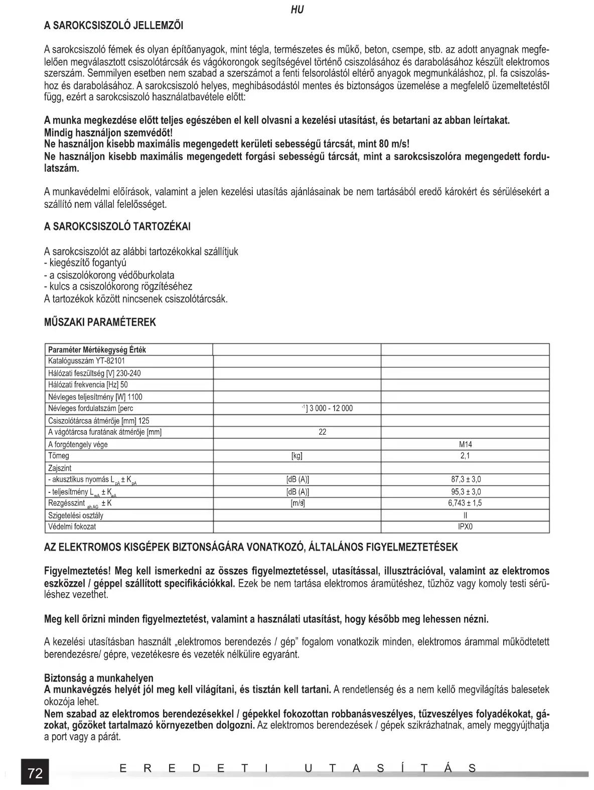 ] 6,743 ± 1,5 Szigetelési osztály II Védelmi fokozat IPX0 AZ ELEKTROMOS KISGÉPEK BIZTONSÁGÁRA VONATKOZÓ, ÁLTALÁNOS FIGYELMEZTETÉSEK Figyelmeztetés! Meg kell ismerkedni az összes fi gyelmeztetéssel, utasítással, illusztrációval, valamint az elektromos eszközzel / géppel szállított specifi kációkkal. Ezek be nem tartása elektromos áramütéshez, tűzhöz vagy komoly testi sérü- léshez vezethet. Meg kell őrizni minden fi gyelmeztetést, valamint a használati utasítást, hogy később meg lehessen nézni. A kezelési utasításban használt „elektromos berendezés / gép” fogalom vonatkozik minden, elektromos árammal működtetett berendezésre/ gépre, vezetékesre és vezeték nélkülire egyaránt. Biztonság a munkahelyen A munkavégzés helyét jól meg kell világítani, és tisztán kell tartani. A rendetlenség és a nem kellő megvilágítás balesetek okozója lehet. Nem szabad az elektromos berendezésekkel / gépekkel fokozottan robbanásveszélyes, tűzveszélyes folyadékokat, gá- zokat, gőzöket tartalmazó környezetben dolgozni. Az elektromos berendezések / gépek szikrázhatnak, amely meggyújthatja a port vagy a párát.73
