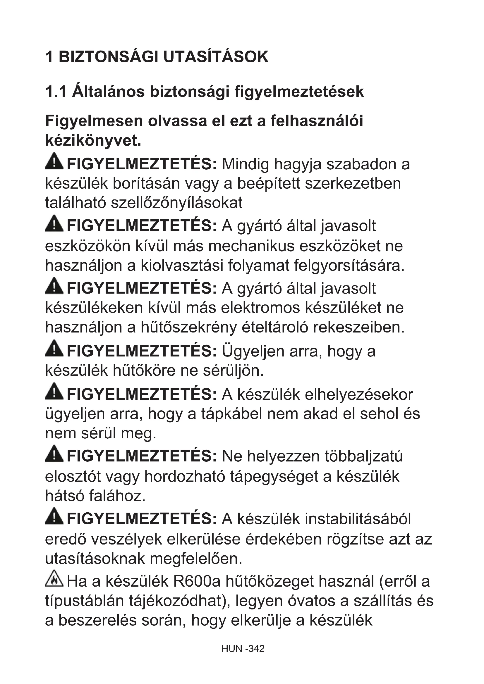 Figyelmesen olvassa el ezt a felhasználói kézikönyvet. FIGYELMEZTETÉS: Mindig hagyja szabadon a készülék borításán vagy a beépített szerkezetben található szellőzőnyílásokat FIGYELMEZTETÉS: A gyártó által javasolt eszközökön kívül más mechanikus eszközöket ne használjon a kiolvasztási folyamat felgyorsítására. FIGYELMEZTETÉS: A gyártó által javasolt készülékeken kívül más elektromos készüléket ne használjon a hűtőszekrény ételtároló rekeszeiben. FIGYELMEZTETÉS: Ügyeljen arra, hogy a készülék hűtőköre ne sérüljön. FIGYELMEZTETÉS: A készülék elhelyezésekor ügyeljen arra, hogy a tápkábel nem akad el sehol és nem sérül meg. FIGYELMEZTETÉS: Ne helyezzen többaljzatú elosztót vagy hordozható tápegységet a készülék hátsó falához. FIGYELMEZTETÉS: A készülék instabilitásából eredő veszélyek elkerülése érdekében rögzítse azt az utasításoknak megfelelően. Ha a készülék R600a hűtőközeget használ (erről a típustáblán tájékozódhat), legyen óvatos a szállítás és a beszerelés során, hogy elkerülje a készülékHUN - 343 hűtőelemeinek sérülését. Annak ellenére, hogy az R600a környezetbarát és természetes gáz, ugyanakkor robbanásveszélyes is. Ha a hűtőelemek sérülése miatt szivárgást tapasztalna, távolítsa el a hűtőszekrényt nyílt láng, illetve hőforrások közeléből és szellőztesse néhány percig a helyiséget, ahol a készülék található.