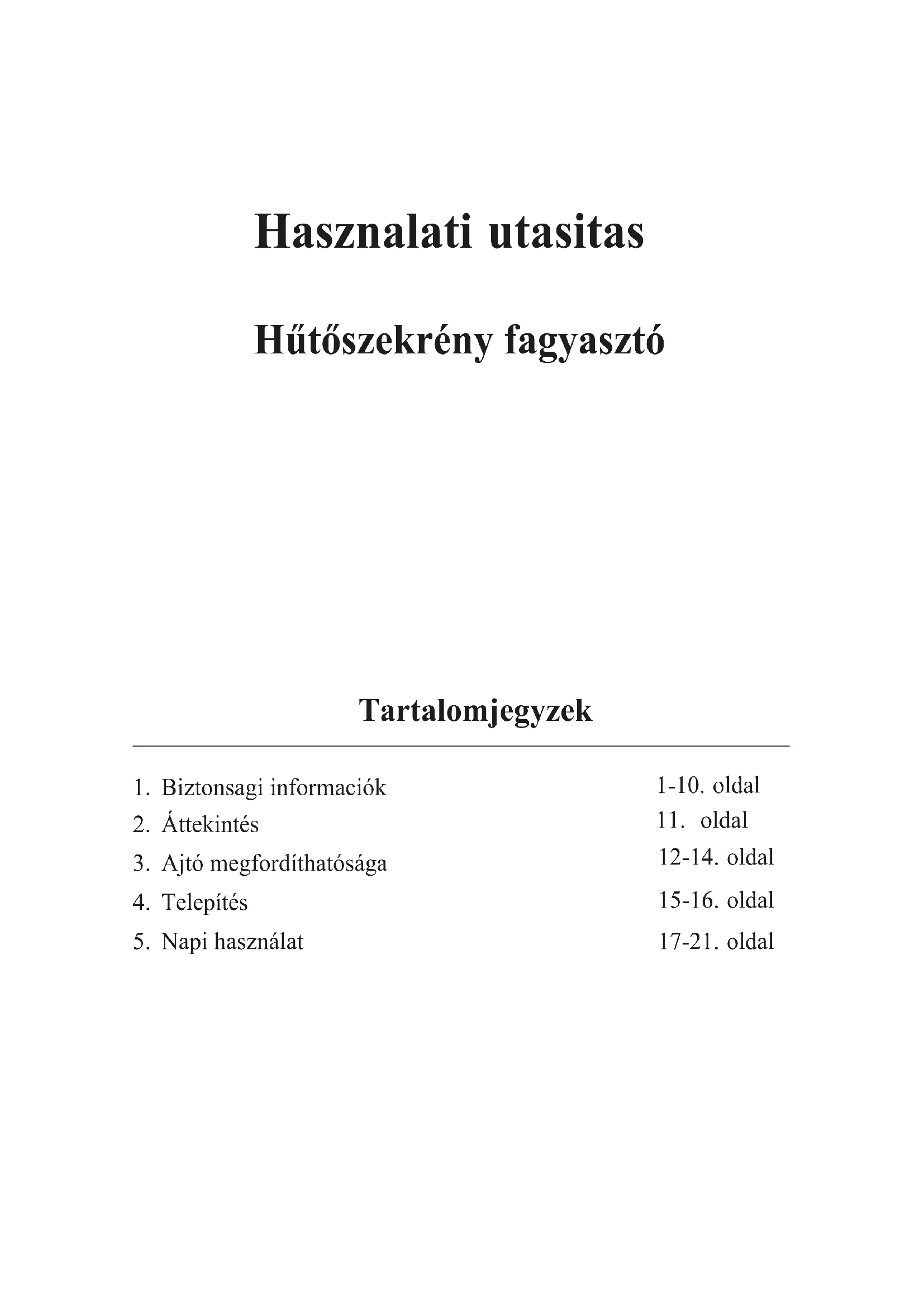 Napi használat 17-21. oldalKöszönjük, hogy megvásárolta a terméket. Az optimális teljesítmény érdekében hűtőszekrény használata előtt alaposan olvassa el a használati útmutatót. Őrizze meg a dokumentációt későbbi használatra, illetve más tulajdonosok részre. A termék kizárólag háztartási használatra és más hasonló alkalmazási módokra alkalmas, például: - üzletek, irodák és egyéb munkakörnyezetek személyzeti konyhahelyisége - gazdaságok, hotelek, motelek és egyéb lakókörnyezetek konyhahelyisége - panziók konyhahelyisége - nem kereskedelmi célú vendéglátási és egyéb szolgáltatások. A ké szülék kizárólag élelmiszerek tárolására szolgál, minden más alkalmazási mód veszélyesnek minősül, így a gyártó nem vállalja a felelősséget ezekért. Emellett azt javasoljuk, hogy figyeljen a jótállás feltételeire.