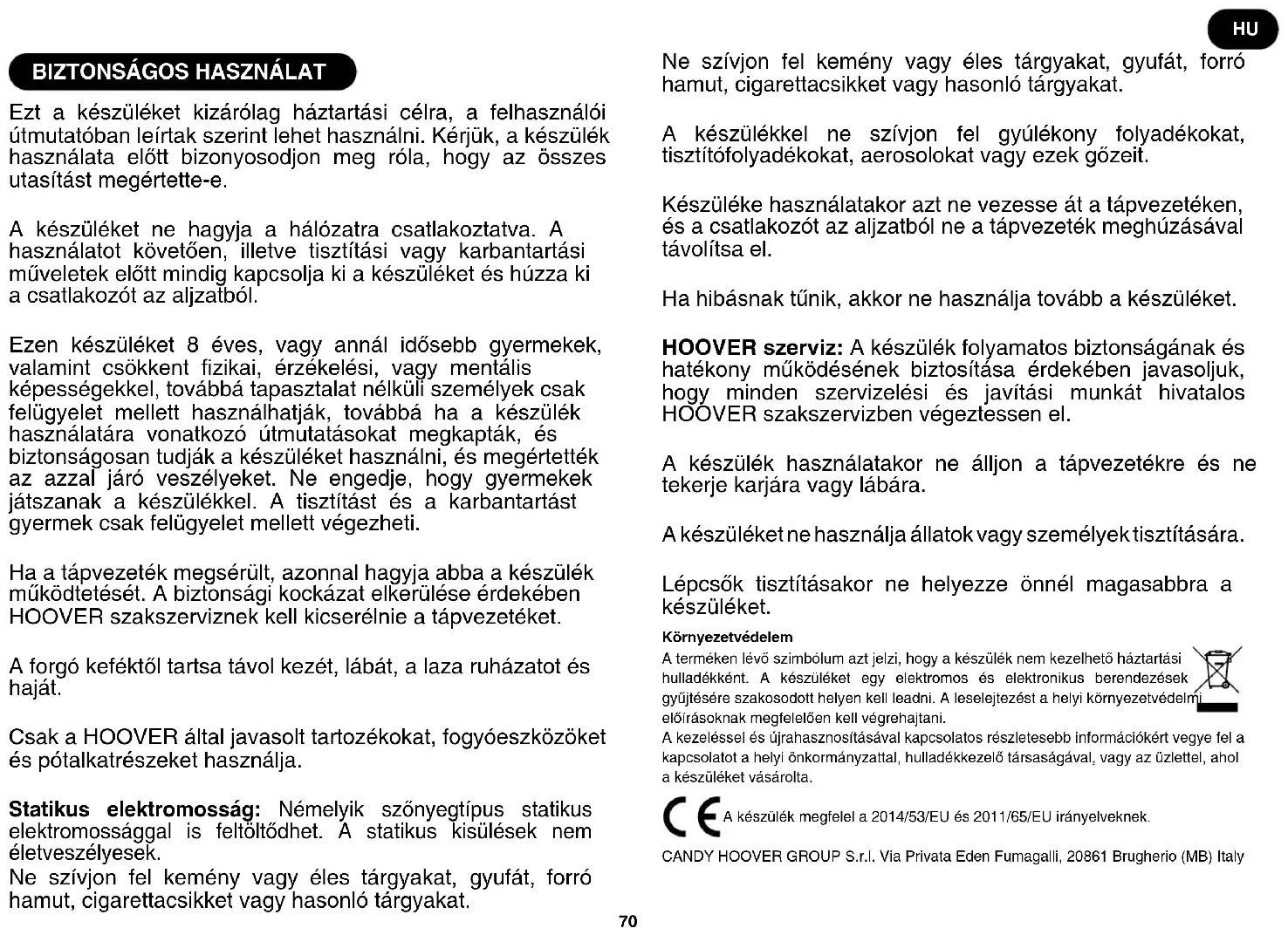 Ezt a készüléket kizárólag háztartási célra, a felhasználói útmutatóban leírtak szerint lehet használni. Kérjük, a készülék használata előtt bizonyosodjon meg róla, hogy az összes utasítást megértette-e. A készüléket ne hagyja a hálózatra csatlakoztatva. A használatot követően, illetve tisztítási vagy karbantartási műveletek előtt mindig kapcsolja ki a készüléket és húzza ki a csatlakozót az aljzatból. Ezen készüléket 8 éves, vagy annál idősebb gyermekek, valamint csökkent zikai, érzékelési, vagy mentális képességekkel, továbbá tapasztalat nélküli személyek csak felügyelet mellett használhatják, továbbá ha a készülék használatára vonatkozó útmutatásokat megkapták, és biztonságosan tudják a készüléket használni, és megértették az azzal járó veszélyeket. Ne engedje, hogy gyermekek játszanak a készülékkel. A tisztítást és a karbantartást gyermek csak felügyelet mellett végezheti. Ha a tápvezeték megsérült, azonnal hagyja abba a készülék működtetését. A biztonsági kockázat elkerülése érdekében HOOVER szakszerviznek kell kicserélnie a tápvezetéket. A forgó keféktől tartsa távol kezét, lábát, a laza ruházatot és haját. Csak a HOOVER által javasolt tartozékokat, fogyóeszközöket és pótalkatrészeket használja. Statikus elektromosság: Némelyik szőnyegtípus statikus elektromossággal is feltöltődhet. A statikus kisülések nem életveszélyesek. Ne szívjon fel kemény vagy éles tárgyakat, gyufát, forró hamut, cigarettacsikket vagy hasonló tárgyakat. Ne szívjon fel kemény vagy éles tárgyakat, gyufát, forró hamut, cigarettacsikket vagy hasonló tárgyakat. A készülékkel ne szívjon fel gyúlékony folyadékokat, tisztítófolyadékokat, aerosolokat vagy ezek gőzeit. Készüléke használatakor azt ne vezesse át a tápvezetéken, és a csatlakozót az aljzatból ne a tápvezeték meghúzásával távolítsa el. Ha hibásnak tűnik, akkor ne használja tovább a készüléket. HOOVER szerviz: A készülék folyamatos biztonságának és hatékony működésének biztosítása érdekében javasoljuk, hogy minden szervizelési és javítási munkát hivatalos HOOVER szakszervizben végeztessen el. A készülék használatakor ne álljon a tápvezetékre és ne tekerje karjára vagy lábára. A készüléket ne használja állatok vagy személyek tisztítására. Lépcsők tisztításakor ne helyezze önnél magasabbra a készüléket. Környezetvédelem A terméken lévő szimbólum azt jelzi, hogy a készülék nem kezelhető háztartási hulladékként. A készüléket egy elektromos és elektronikus berendezések gyűjtésére szakosodott helyen kell leadni. A leselejtezést a helyi környezetvédelmi előírásoknak megfelelően kell végrehajtani. A kezeléssel és újrahasznosításával kapcsolatos részletesebb információkért vegye fel a kapcsolatot a helyi önkormányzattal, hulladékkezelő társaságával, vagy az üzlettel, ahol a készüléket vásárolta. A készülék megfelel a 2014/53/EU és 2011/65/EU irányelveknek. CANDY HOOVER GROUP S.r.l. Via Privata Eden Fumagalli, 20861 Brugherio (MB) Italy HU71