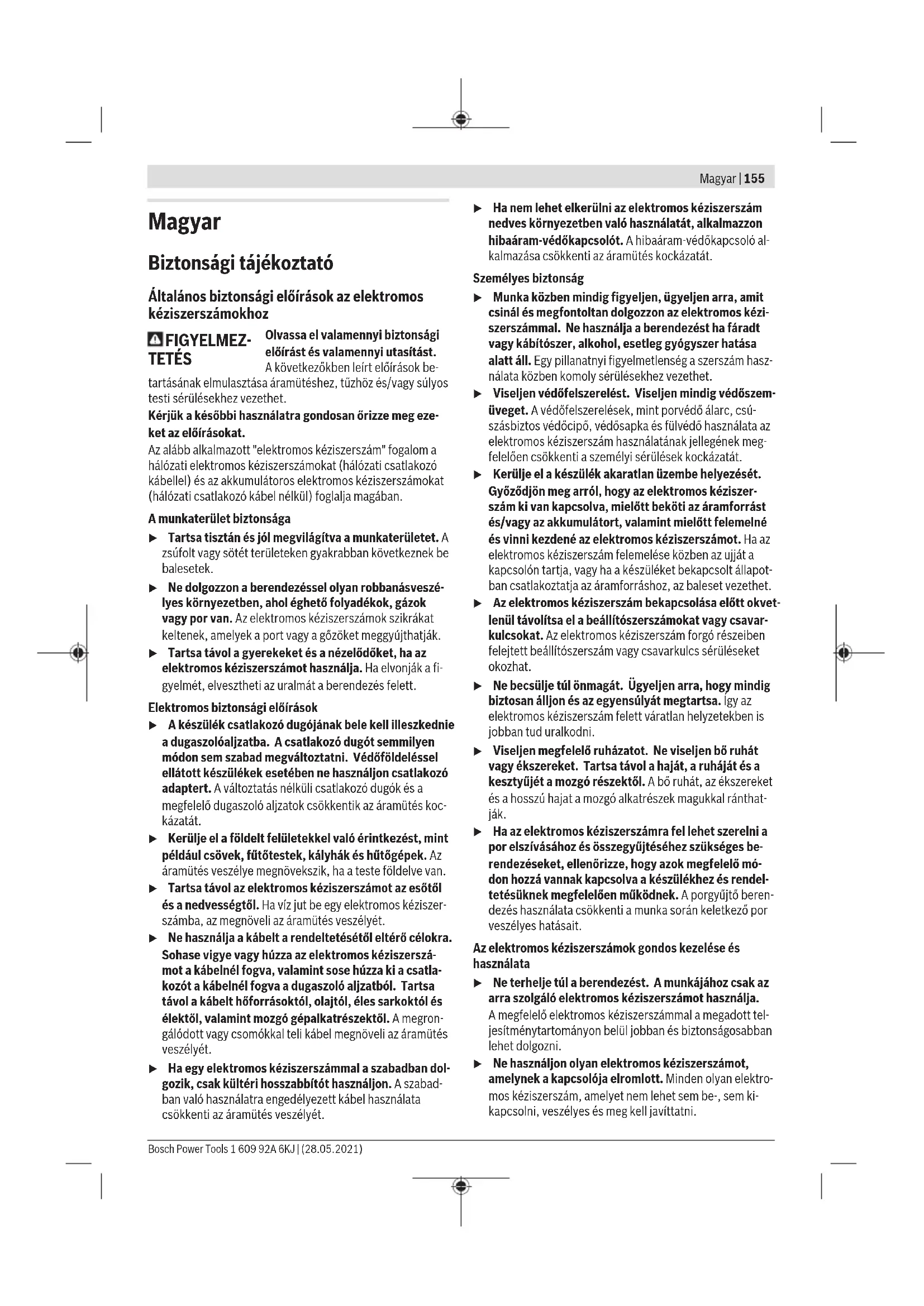 A fordulatszám fokozatoknál megadott fordulatszámok tájékoztató értékek. u A betétszerszám megengedett fordulatszámának leg- alább akkorának kell lennie, mint az elektromos kézi- szerszámon megadott legnagyobb fordulatszámnak. A megengedettnél gyorsabban forgó betétszerszámok szét- törhetnek és kirepülhetnek. Újraindulás elleni védelem Az újraindulás elleni védelem az áramellátás megszakítása majd helyreállítása esetén meggátolja az elektromos kézi- szerszám akaratlan újraindulását. Az ismételt üzembe helyezéshez hozza a (2) be-/kikapcso- lót a kikapcsolt helyzetbe, majd ismét kapcsolja be az elekt- romos kéziszerszámot. Munkavégzési tanácsok u Az elektromos kéziszerszámon végzendő bármely munka megkezdése előtt húzza ki a csatlakozó dugót a dugaszolóaljzatból. u Tartófalakban való vágások esetén legyen óvatos, lásd a „Statikai megjegyzések“ című fejezetet. u Fogja be a munkadarabot, ha az a saját súlyánál fogva nem helyezkedik el biztonságosan. u Ne terhelje annyira meg az elektromos kéziszerszá- mot, hogy az ettől leálljon. u Magas terhelés után hagyja még néhány percig üresjá- ratban működni az elektromos kéziszerszámot, hogy a betétszerszám lehűljön. u Ne használja az elektromos kéziszerszámot egy dara- boló állvánnyal. u Ne érjen hozzá a csiszoló- és darabolókorongokhoz, amíg le nem hűltek. A korongok a munka során igen erő- sen felforrósodnak. Nagyoló csiszolás u Sohase használjon hasítókorongokat nagyoló csiszo- láshoz. Nagyoló csiszolásnál a legjobb eredmények eléréséhez 30° – 40° állásszöget használjon. Mérsékelt nyomással mozgassa ide-oda az elektromos kéziszerszámot. Így a munkadarab nem lesz túl forró, nem színeződik el és nem keletkeznek raj- ta barázdák. Legyezős csiszolókorong A legyezős csiszolókoronggal (külön tartozék) homorú és domború felületeket és profilokat is meg lehet munkálni. A legyezős csiszolókorongoknak lényegesen nagyobb az élet- tartama, alacsonyabb a zajszintje és alacsonyabb csiszolási hőmérsékletekhez vezetnek, mint a szokásos csiszolókoron- gok. Fémek darabolása u Ha kötött csiszolóanyaggal ellátott koronggal végez darabolást, használja mindig a darabolásra szolgáló (8) védőbúrát. A daraboló csiszoláshoz használjon a megmunkálásra kerülő anyagnak megfelelő, mérsékelt előtolást. Ne gyakoroljon nyomást a daraboló korongra, ne ékelje be és ne oszcillálja a korongot. Ne fékezze le a kifutó daraboló korongokat a korong oldalára gyakorolt nyomással. Az elektromos kéziszerszá- mot mindig a forgásirányá- val ellentétes irányban kell vezetni. Ellenkező esetben a készülék irányíthatatla- nul kiugorhat a vágásból. Profilok és négyszögletes csövek darabolásánál a leg- célszerűbb a legkisebb ke- resztmetszetnél kezdeni a darabolást. Kő darabolása u Kőben végzett darabolási munkákhoz megfelelő porel- szívásról kell gondoskodni. u Viseljen porvédő álarcot. u Az elektromos kéziszerszámot csak száraz darabolás- ra / száraz csiszolásra szabad használni. Kövek darabolásához a legcélszerűbb egy gyémántbetétes daraboló korongot használni . A (22) vezetőszánnal felszerelt, darabolásra szolgáló elszí- vóbúra alkalmazása esetén a porszívónak engedélyezve kell lennie kőpor elszívására. Bosch erre alkalmas porszívókat tud szállítani. Kapcsolja be az elektromos kéziszerszámot és tegye rá a vezetőszán első részével a munkadarabra. Az elektro- mos kéziszerszámot mérsé- kelt, a megmunkálásra kerü- lő anyagnak megfelelő elő- tolással tolja előre. Különösen kemény anya- gok, például magas kavics- tartalmú beton darabolása során a gyémántbetétes daraboló Bosch Power Tools 1 609 92A 6KJ | (28.05.2021)164 | Русский korong túlhevülhet és ennek következtében megrongálód- hat. Egy szikrakörrel körülvett gyémántbetétes daraboló ko- rong határozottan erre utal. Ebben az esetben szakítsa meg a darabolási eljárást és járas- sa a gyémántbetétes daraboló korongot rövid ideig üresjá- ratban a legmagasabb fordulatszámon, hogy az lehűlhessen. Ha a munkateljesítmény észrevehetően csökken és a tárcsát szikrakoszorú veszi körül, akkor ez arra utal, hogy a darabo- lótárcsa eltompult. Az ilyen daraboló korongot erősen kopta- tó anyagban, például mészhomokkőben végzett rövid vágá- sokkal ismét ki lehet élesíteni. Statikai megjegyzések Tartófalakban nyitott vágásoknak meg kell felelniük a DIN1053 szabvány 1. részében leírtaknak, vagy az adott or- szágban érvényes előírásoknak. Ezeket az előírásokat okvet- lenül be kell tartani. Kérje ki a munka megkezdése előtt a fe- lelős statikus, építészmérnök vagy építésvezetőség tanácsát. Karbantartás és szerviz Karbantartás és tisztítás u Az elektromos kéziszerszámon végzendő bármely munka megkezdése előtt húzza ki a csatlakozó dugót a dugaszolóaljzatból. u Tartsa mindig tisztán az elektromos kéziszerszámot és annak szellőzőnyílásait, hogy jól és biztonságosan dol- gozhasson. u Extrém munkafeltételek esetén a lehetőségnek meg- felelően mindig használjon egy elszívó berendezést. Fújja ki gyakran a szellőzőnyílásokat, és iktasson be a hálózati vezeték elé egy hibaáram védőkapcsolót (PRCD). Fémek megmunkálása során vezetőképes por juthat az elektromos kéziszerszám belsejébe. Ez hátrá- nyos hatással lehet az elektromos kéziszerszám védőszi- getelésére. A tartozékokat gondosan tárolja és kezelje. Ha a csatlakozó vezetéket ki kell cserélni, akkor a cserével csak a magát a Bosch céget, vagy egy Bosch elektromos ké- ziszerszám-műhely ügyfélszolgálatát szabad megbízni, ne- hogy a biztonságra veszélyes szituáció lépjen fel. Vevőszolgálat és alkalmazási tanác