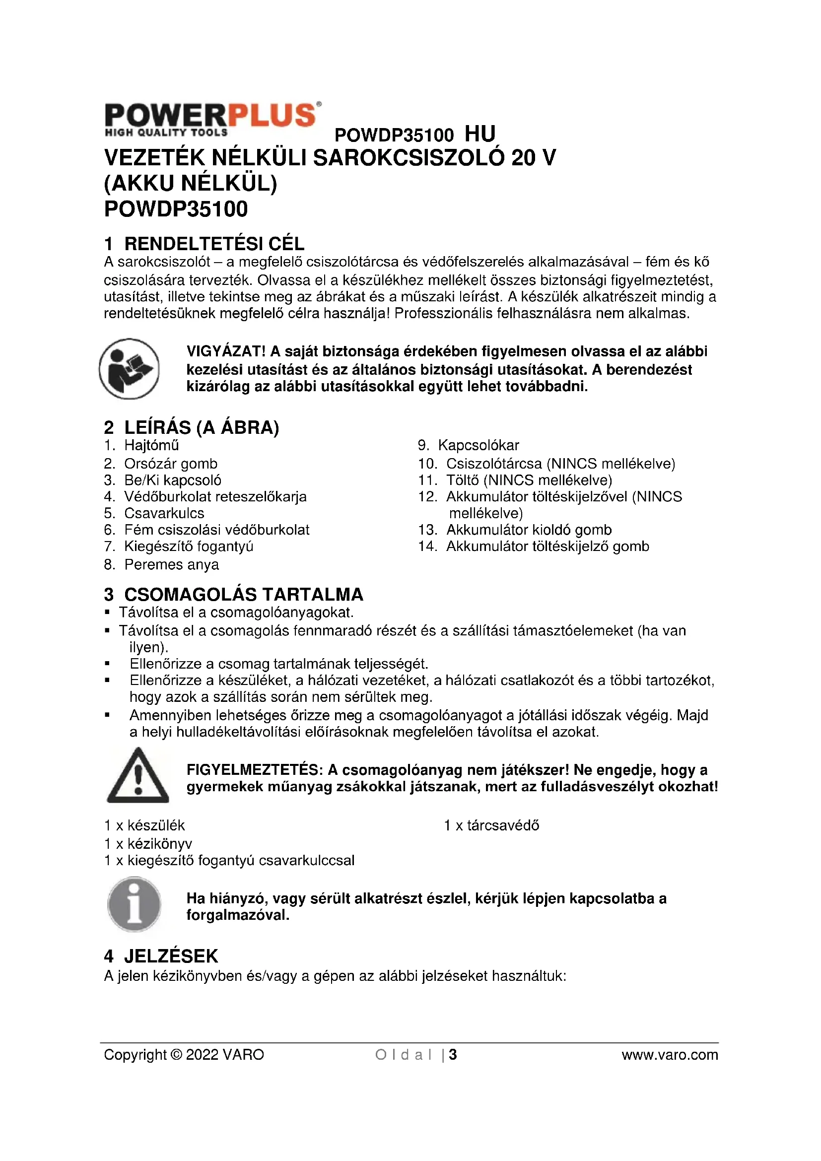 Olvasson el mundoBiztonsagi figyelmeztetest es minded utasitast. A figyelmeztetesek es utasitask betartasanak elmulasztasa aramutest, tuzet es/vagy sulyos serulest okozhat. Orizze meg a figyelmeztetsek es utasitask leirasat jovobeni hivatkozac celjabol. A figyelmeztetsekben elofordulo berendezes (power tool) kifejezes a halozatról muködtetett (vezetekes) berendezesre, vagy az elements (vezetekmentes) berendezesre utal.