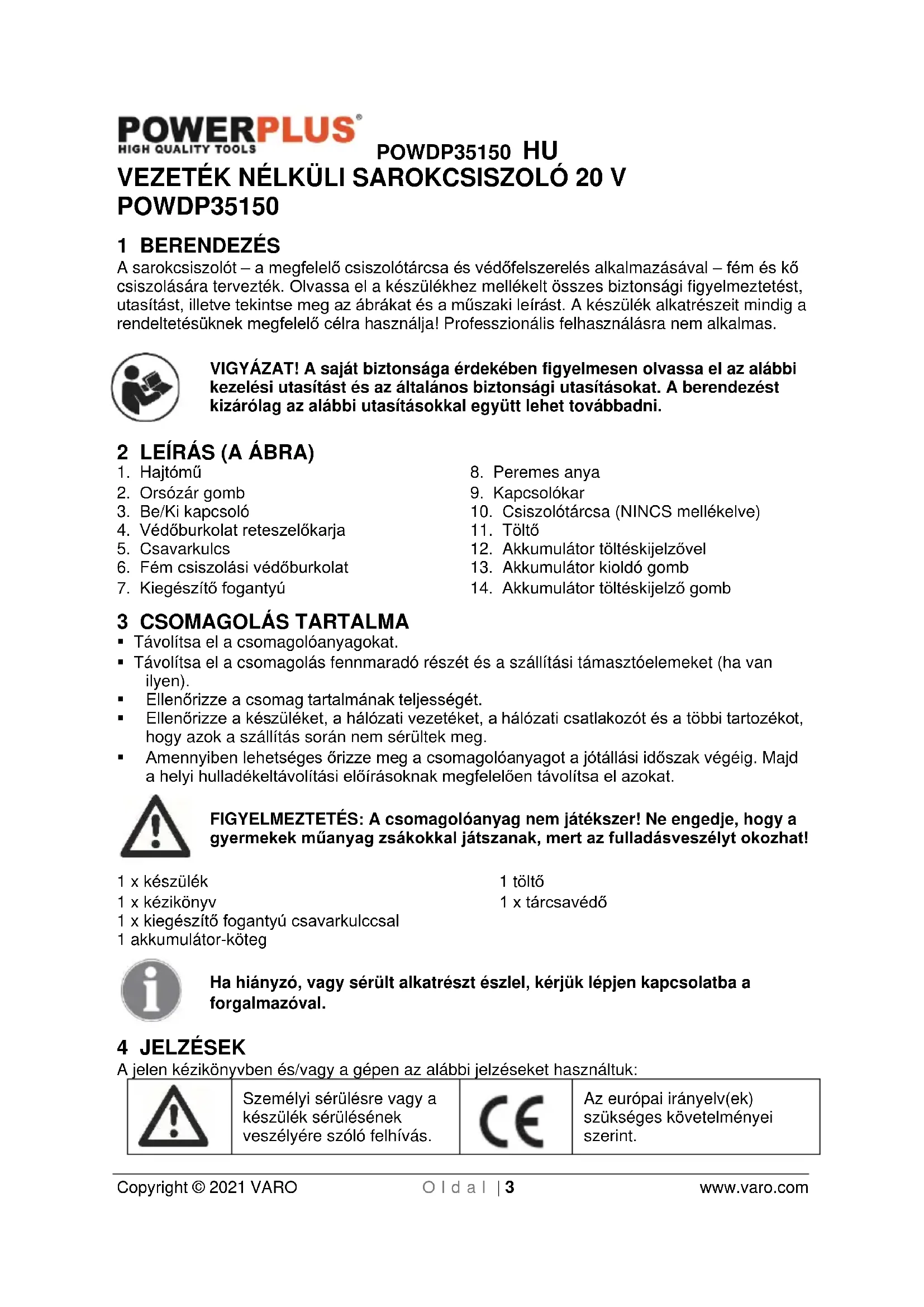 - A csiszolótárcsákat a gyártó által meghatározott utasításoknak megfelelően kezelje és tárolja.POWDP35150 HU Copyright © 2021 VARO O l d a l | 7 www.varo.com