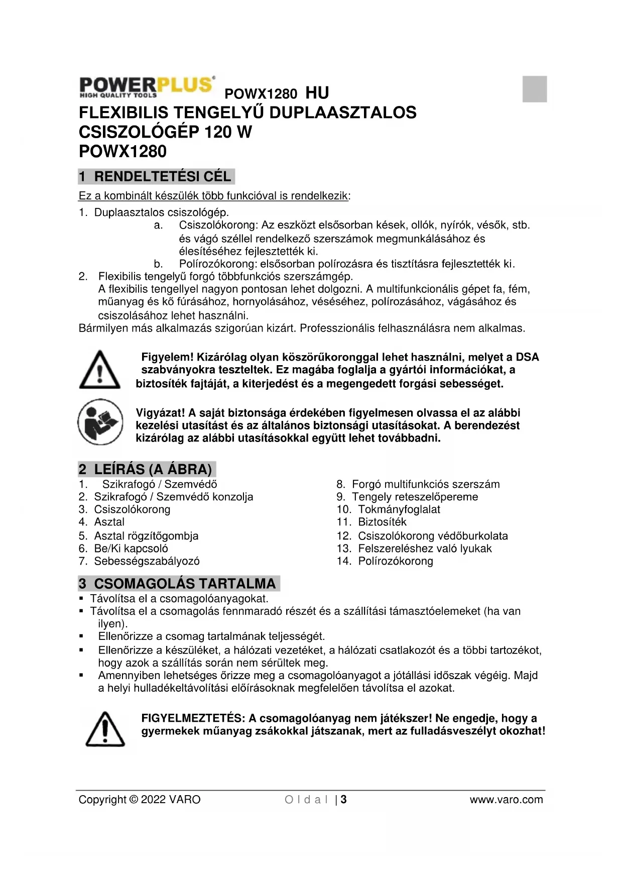 - A karbantartási munkálatok, vagy a készüléken végzett egyéb munkálatok megkezdése előtt, (például össze- vagy szétszerelés, módosítás, stb.), mindig áramtalanítsa a készüléket, és várja meg, hogy a készülék leálljon.POWX1280 HU Copyright © 2022 VARO O l d a l | 7 www.varo.com