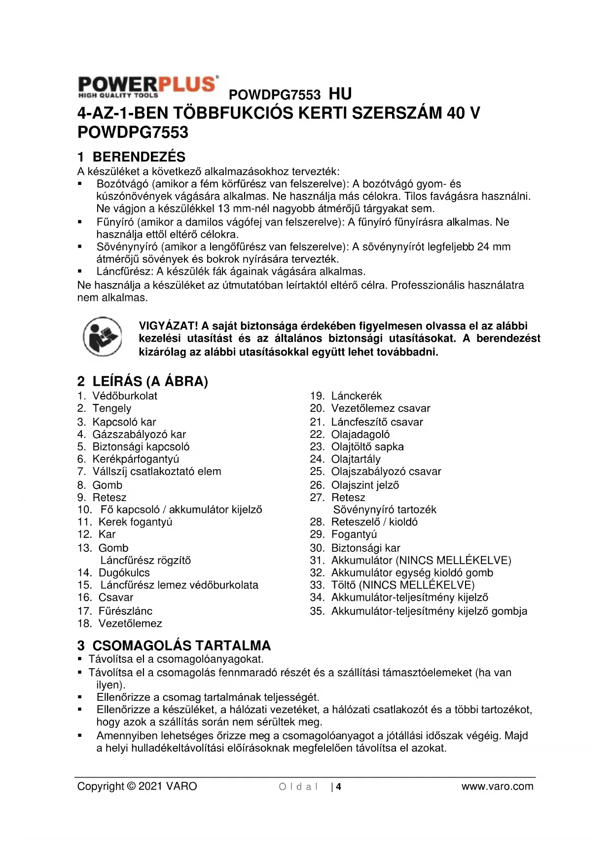 Copyright © 2021 VARO O l d a l | 4 www.varo.com 4-AZ-1-BEN TÖBBFUKCIÓS KERTI SZERSZÁM 40 V POWDPG7553 1 BERENDEZÉS A készüléket a következő alkalmazásokhoz tervezték: