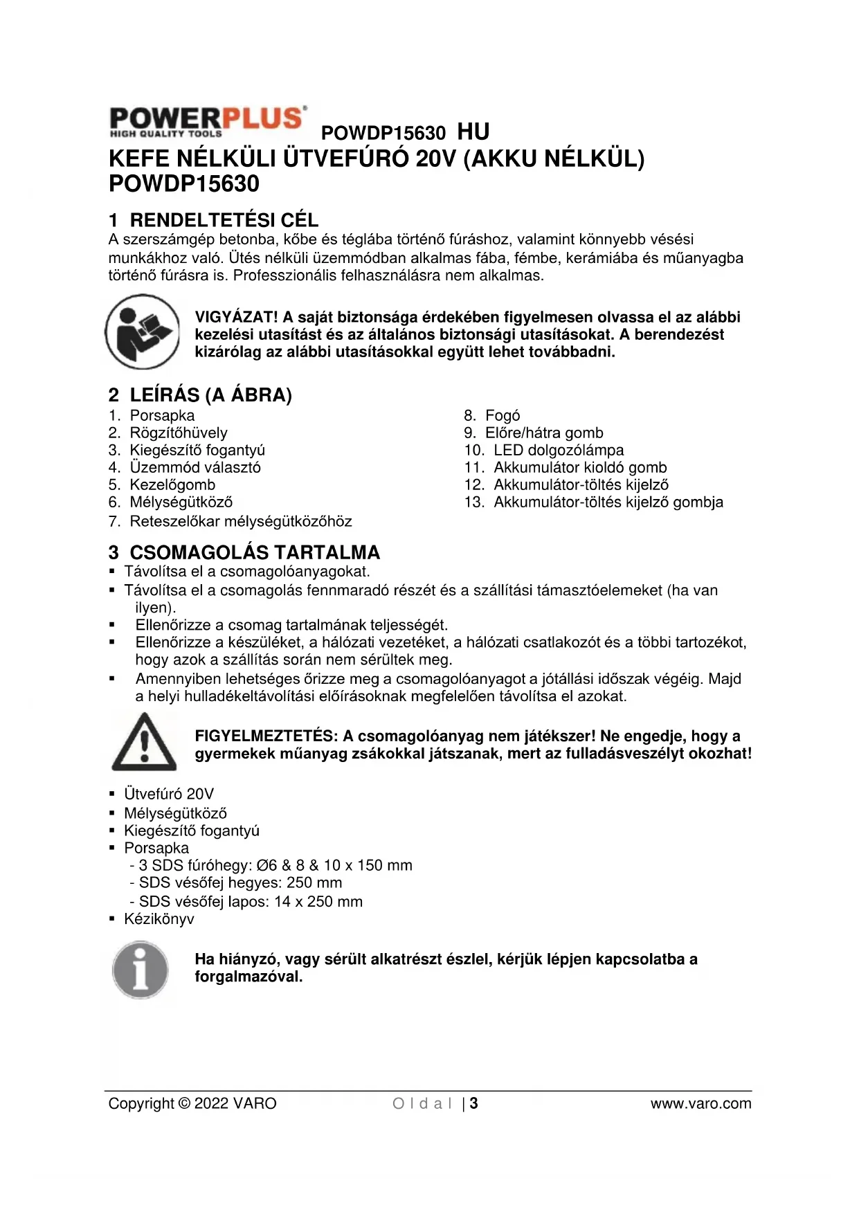 - Az elektromos működtetésű szerszámokat, tartozékokat, betéteket az utasításoknak és az adott típusú eszköznek megfelelően használja, figyelembe véve a munkafeltételeket és a végrehajtandó tevékenységet. Az elektromos működtetésű szerszámok rendeltetéstől eltérő használata veszélyes helyzetekhez vezethet.POWDP15630 HU Copyright © 2022 VARO O l d a l | 6 www.varo.com