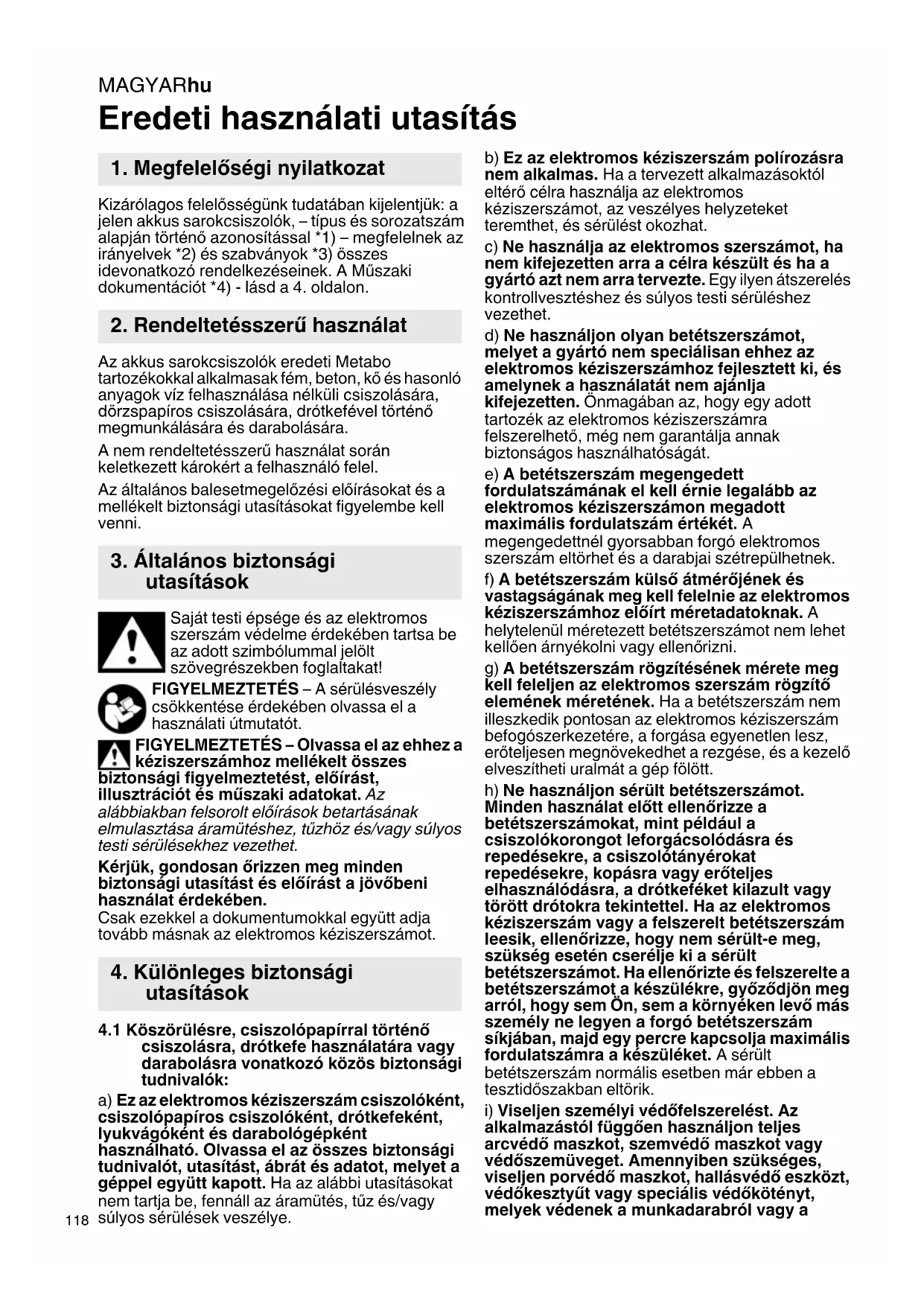 Eredeti használati utasítás Kizárólagos felelősségünk tudatában kijelentjük: a jelen akkus sarokcsiszolók, – típus és sorozatszám alapján történő azonosítással *1) – megfelelnek az irányelvek *2) és szabványok *3) összes idevonatkozó rendelkezéseinek. A Műszaki dokumentációt *4) - lásd a 4. oldalon. Az akkus sarokcsiszolók eredeti Metabo tartozékokkal alkalmasak fém, beton, kő és hasonló anyagok víz felhasználása nélküli csiszolására, dörzspapíros csiszolására, drótkefével történő megmunkálására és darabolására. A nem rendeltetésszerű használat során keletkezett károkért a felhasználó felel. Az általános balesetmegelőzési előírásokat és a mellékelt biztonsági utasításokat figyelembe kell venni. Saját testi épsége és az elektromos szerszám védelme érdekében tartsa be az adott szimbólummal jelölt szövegrészekben foglaltakat! FIGYELMEZTETÉS – A sérülésveszély csökkentése érdekében olvassa el a használati útmutatót. FIGYELMEZTETÉS – Olvassa el az ehhez a kéziszerszámhoz mellékelt összes biztonsági figyelmeztetést, előírást, illusztrációt és műszaki adatokat. Az alábbiakban felsorolt előírások betartásának elmulasztása áramütéshez, tűzhöz és/vagy súlyos testi sérülésekhez vezethet. Kérjük, gondosan őrizzen meg minden biztonsági utasítást és előírást a jövőbeni használat érdekében. Csak ezekkel a dokumentumokkal együtt adja tovább másnak az elektromos kéziszerszámot.