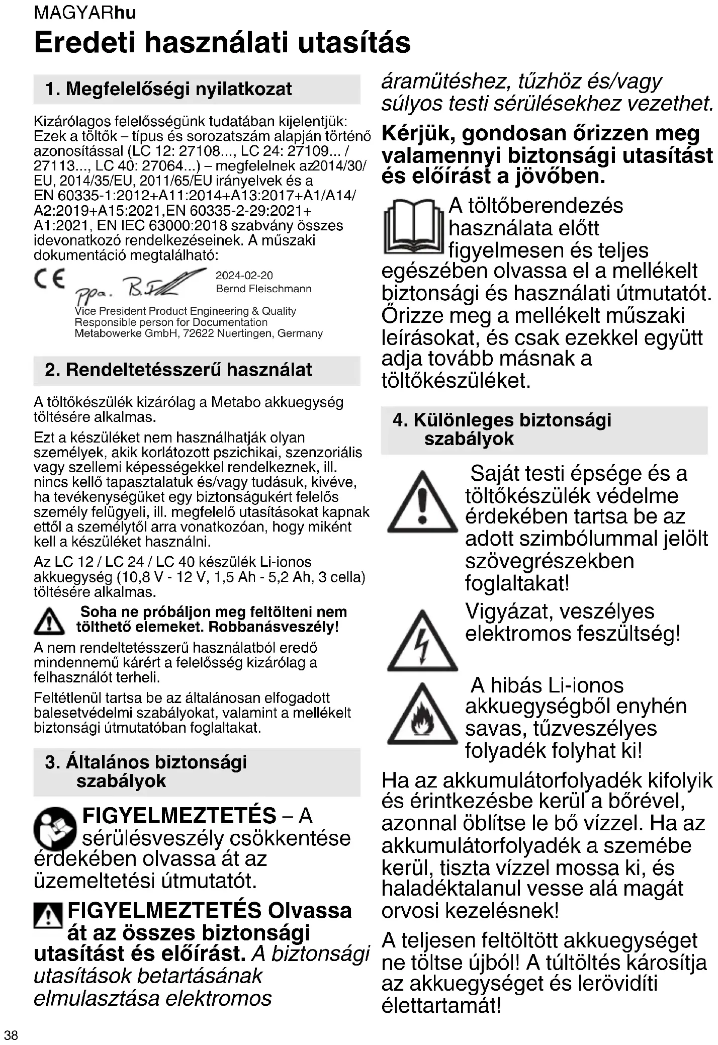 Eredeti használati utasítás Kizárólagos felelősségünk tudatában kijelentjük: Ezek a töltők – típus és sorozatszám alapján történő azonosítással (LC 12: 27108..., LC 24: 27109... / 27113..., LC 40: 27064...) – megfelelnek az 2014/30/ EU, 2014/35/EU, 2011/65/EU irányelvek és a EN 60335-1:2012+A11:2014+A13:2017+A1/A14/ A2:2019+A15:2021,EN 60335-2-29:2021+ A1:2021, EN IEC 63000:2018 szabvány összes idevonatkozó rendelkezéseinek. A műszaki dokumentáció megtalálható: A töltőkészülék kizárólag a Metabo akkuegység töltésére alkalmas. Ezt a készüléket nem használhatják olyan személyek, akik korlátozott pszichikai, szenzoriális vagy szellemi képességekkel rendelkeznek, ill. nincs kellő tapasztalatuk és/vagy tudásuk, kivéve, ha tevékenységüket egy biztonságukért felelős személy felügyeli, ill. megfelelő utasításokat kapnak ettől a személytől arra vonatkozóan, hogy miként kell a készüléket használni. Az LC 12 / LC 24 / LC 40 készülék Li-ionos akkuegység (10,8 V - 12 V, 1,5 Ah - 5,2 Ah, 3 cella) töltésére alkalmas. Soha ne próbáljon meg feltölteni nem tölthető elemeket. Robbanásveszély! A nem rendeltetésszerű használatból eredő mindennemű kárért a felelősség kizárólag a felhasználót terheli. Feltétlenül tartsa be az általánosan elfogadott balesetvédelmi szabályokat, valamint a mellékelt biztonsági útmutatóban foglaltakat.