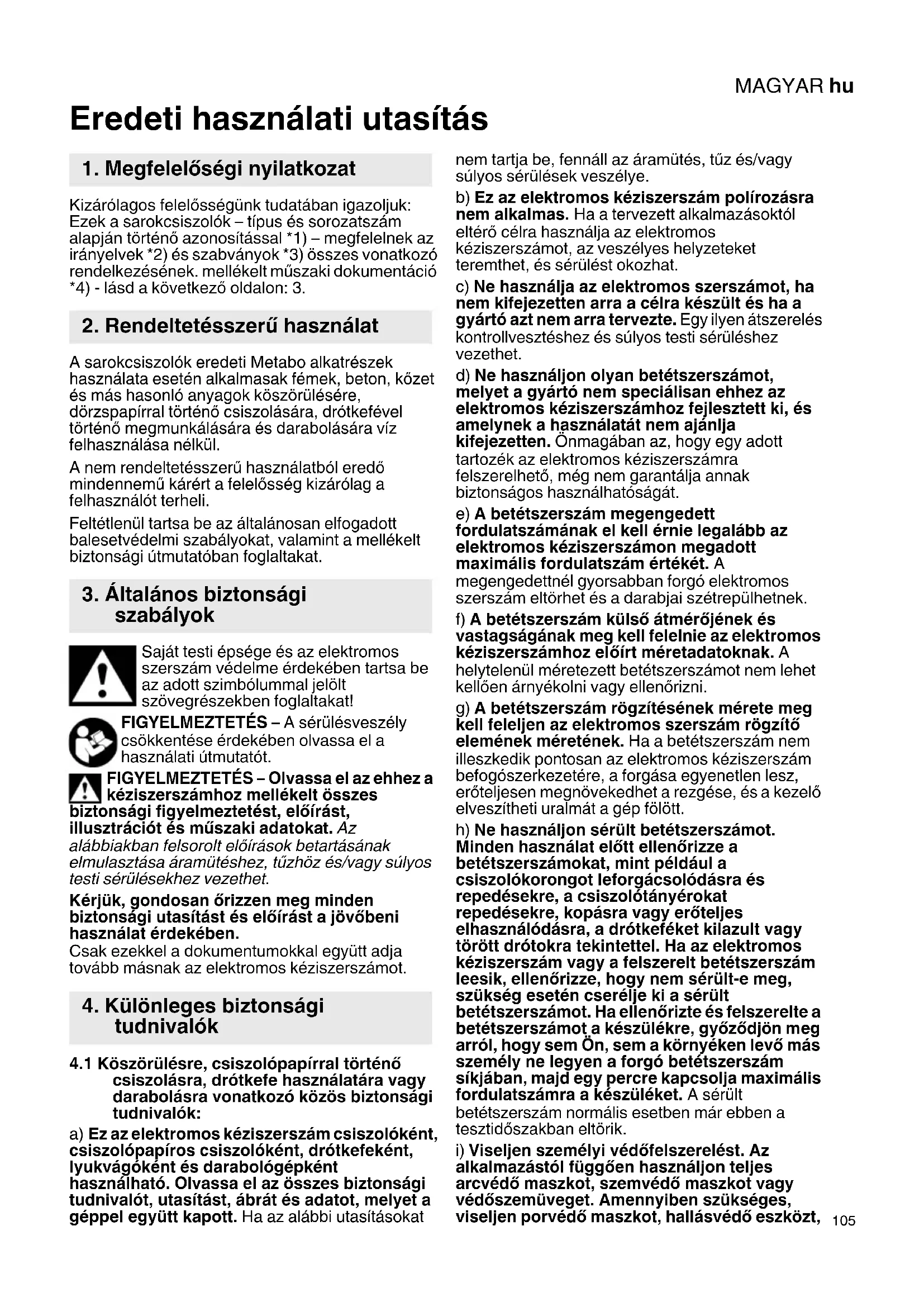 Eredeti használati utasítás Kizárólagos felelősségünk tudatában igazoljuk: Ezek a sarokcsiszolók – típus és sorozatszám alapján történő azonosítással *1) – megfelelnek az irányelvek *2) és szabványok *3) összes vonatkozó rendelkezésének. mellékelt műszaki dokumentáció *4) - lásd a következő oldalon: 3. A sarokcsiszolók eredeti Metabo alkatrészek használata esetén alkalmasak fémek, beton, kőzet és más hasonló anyagok köszörülésére, dörzspapírral történő csiszolására, drótkefével történő megmunkálására és darabolására víz felhasználása nélkül. A nem rendeltetésszerű használatból eredő mindennemű kárért a felelősség kizárólag a felhasználót terheli. Feltétlenül tartsa be az általánosan elfogadott balesetvédelmi szabályokat, valamint a mellékelt biztonsági útmutatóban foglaltakat. Saját testi épsége és az elektromos szerszám védelme érdekében tartsa be az adott szimbólummal jelölt szövegrészekben foglaltakat! FIGYELMEZTETÉS – A sérülésveszély csökkentése érdekében olvassa el a használati útmutatót. FIGYELMEZTETÉS – Olvassa el az ehhez a kéziszerszámhoz mellékelt összes biztonsági figyelmeztetést, előírást, illusztrációt és műszaki adatokat. Az alábbiakban felsorolt előírások betartásának elmulasztása áramütéshez, tűzhöz és/vagy súlyos testi sérülésekhez vezethet. Kérjük, gondosan őrizzen meg minden biztonsági utasítást és előírást a jövőbeni használat érdekében. Csak ezekkel a dokumentumokkal együtt adja tovább másnak az elektromos kéziszerszámot.