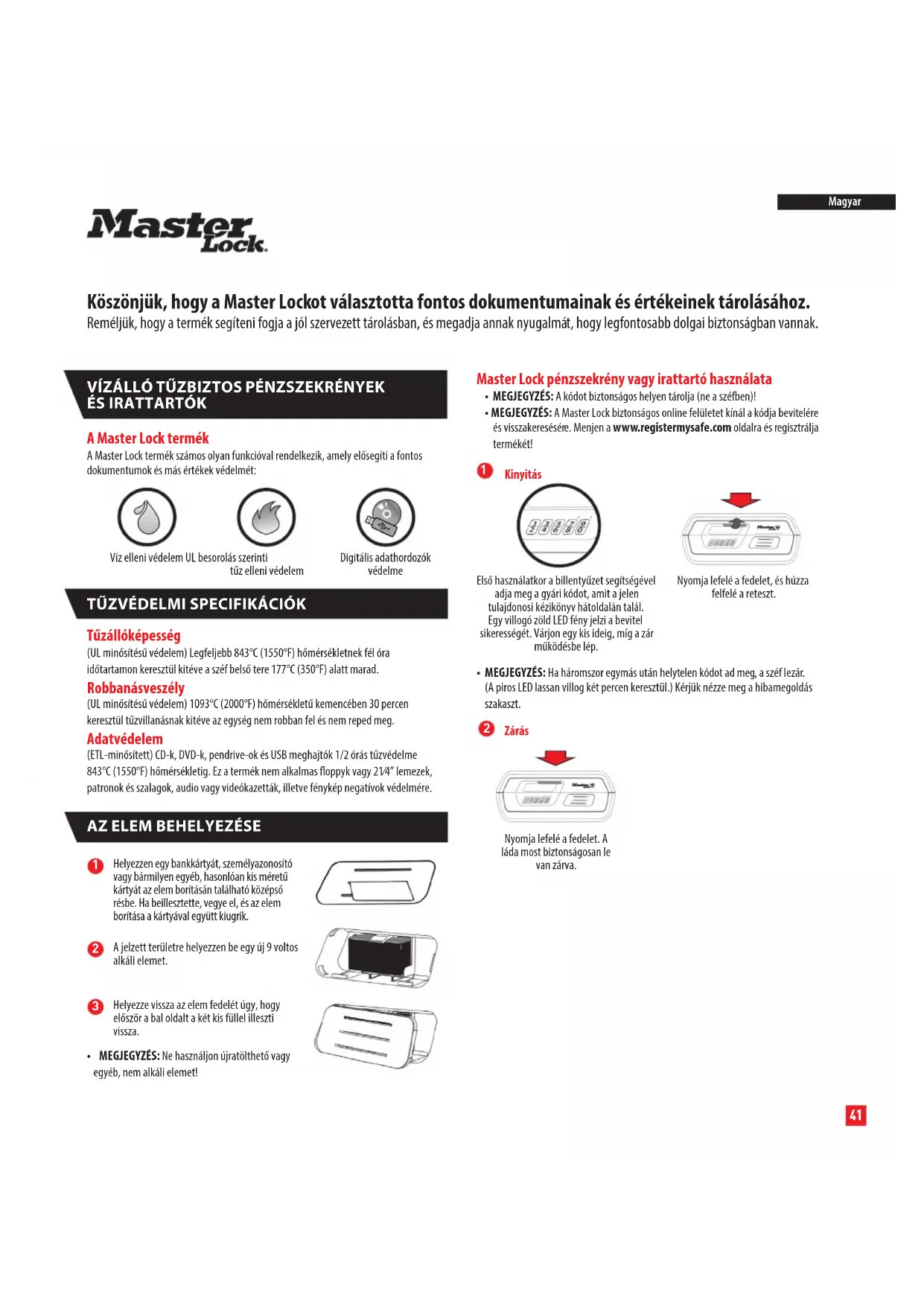 - NE tároljón érzekeny tárgyakat kozvetlenul a túz-és vizallo ladaban! A túzalló Master Lock termékeknek egyedi szigetelesuk van, amelynek magas a nedvessegtartalma. Raadásul a vizallo ladak legmentesen zarnak, hogy Ellenljanak a viznek, ami miatt a nedvesség összegyulhet a ladaban. Kérjuk, kethetente nyissa ka ladát, hogy elkerülje a nedvesség felhalmozódásat.