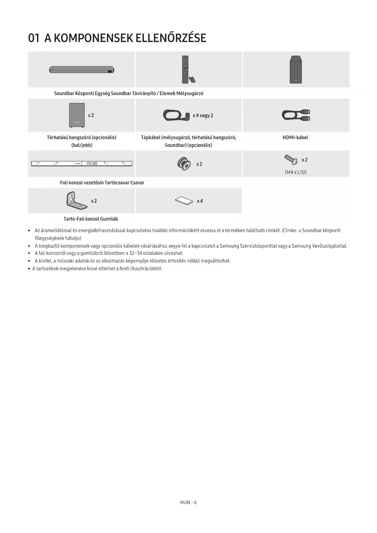 SOUNDBAR Soundbar Központi Egység Soundbar Távirányító / Elemek Mélysugárzó POWER x 2 x 4 vagy 2 Térhatású hangszóró (opcionális) (bal/jobb) Tápkábel (mélysugárzó, térhatású hangszóró, Soundbar) (opcionális) HDMI-kábel x 2 x 2 (M4 x L10) Fali konzol vezetősín Tartócsavar Csavar x 2 x 4 Tartó-Fali konzol Gumiláb