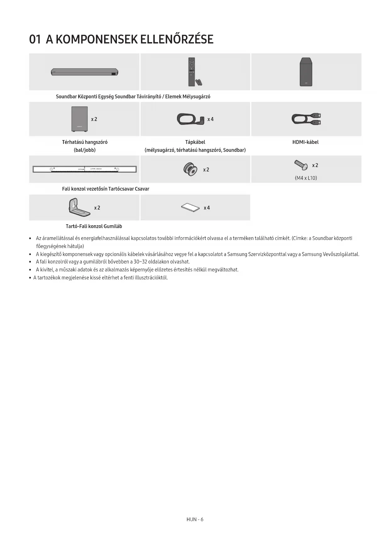 SOUNDBAR Soundbar Központi Egység Soundbar Távirányító / Elemek Mélysugárzó POWER x 2 x 4 Térhatású hangszóró (bal/jobb) Tápkábel (mélysugárzó, térhatású hangszóró, Soundbar) HDMI-kábel A TYPE : 450mm x 2 x 2 (M4 x L10) Fali konzol vezetősín Tartócsavar Csavar x 2 x 4 Tartó-Fali konzol Gumiláb