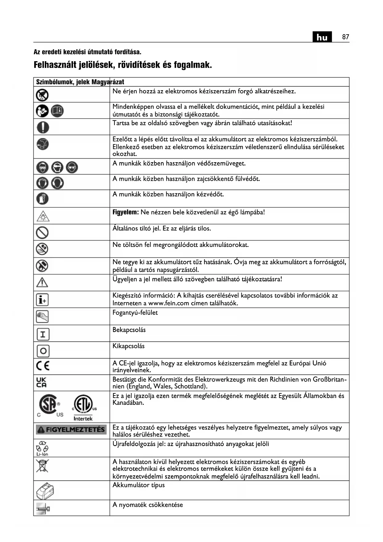 Az eredeti kezelési útmutató fordítása. Felhasznált jelölések, rövidítések és fogalmak. Szimbólumok, jelek Magyarázat Ne érjen hozzá az elektromos kéziszerszám forgó alkatrészeihez. Mindenképpen olvassa el a mellékelt dokumentációt, mint például a kezelési útmutatót és a biztonsági tájékoztatót. Tartsa be az oldalsó szövegben vagy ábrán található utasításokat! Ezelőtt a lépés előtt távolítsa el az akkumulátort az elektromos kéziszerszámból. Ellenkező esetben az elektromos kéziszerszám véletlenszerű elindulása sérüléseket okozhat. A munkák közben használjon védőszemüveget. A munkák közben használjon zajcsökkentő fülvédőt. A munkák közben használjon kézvédőt. Figyelem: Ne nézzen bele közvetlenül az égő lámpába! Általános tiltó jel. Ez az eljárás tilos. Ne töltsön fel megrongálódott akkumulátorokat. Ne tegye ki az akkumulátort tűz hatásának. Óvja meg az akkumulátort a forróságtól, például a tartós napsugárzástól. Ügyeljen a jel mellett álló szövegben található tájékoztatásra! Kiegészító információ: A kihajtás cserélésével kapcsolatos további információk az Interneten a www.fein.com címen találhatók. Fogantyú-felület Bekapcsolás Kikapcsolás A CE-jel igazolja, hogy az elektromos kéziszerszám megfelel az Európai Unió irányelveinek. Bestätigt die Konformität des Elektrowerkzeugs mit den Richtlinien von Großbritan- nien (England, Wales, Schottland). Ez a jel igazolja ezen termék megfelelőségének meglétét az Egyesült Államokban és Kanadában. Ez a tájékozató egy lehetséges veszélyes helyzetre figyelmeztet, amely súlyos vagy halálos sérüléshez vezethet. Újrafeldolgozás jel: az újrahasznosítható anyagokat jelöli A használaton kívül helyezett elektromos kéziszerszámokat és egyéb elektrotechnikai és elektromos termékeket külön össze kell gyűjteni és a környezetvédelmi szempontoknak megfelelő újrafelhasználásra kell leadni. Akkumulátor típus A nyomaték csökkentése88