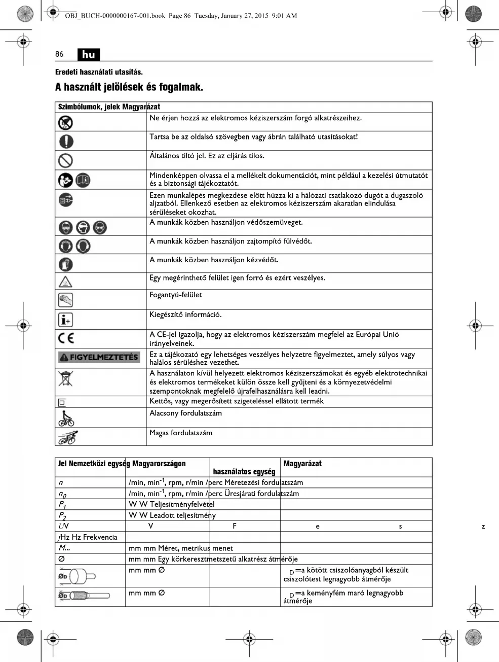 Eredeti használati utasítás. A használt jelölések és fogalmak. Szimbólumok, jelek Magyarázat Ne érjen hozzá az elektromos kéziszerszám forgó alkatrészeihez. Tartsa be az oldalsó szövegben vagy ábrán található utasításokat! Általános tiltó jel. Ez az eljárás tilos. Mindenképpen olvassa el a mellékelt dokumentációt, mint például a kezelési útmutatót és a biztonsági tájékoztatót. Ezen munkalépés megkezdése előtt húzza ki a hálózati csatlakozó dugót a dugaszoló aljzatból. Ellenkező esetben az elektromos kéziszerszám akaratlan elindulása sérüléseket okozhat. A munkák közben használjon védőszemüveget. A munkák közben használjon zajtompító fülvédőt. A munkák közben használjon kézvédőt. Egy megérinthető felület igen forró és ezért veszélyes. Fogantyú-felület Kiegészítő információ. A CE-jel igazolja, hogy az elektromos kéziszerszám megfelel az Európai Unió irányelveinek. Ez a tájékozató egy lehetséges veszélyes helyzetre figyelmeztet, amely súlyos vagy halálos sérüléshez vezethet. A használaton kívül helyezett elektromos kéziszerszámokat és egyéb elektrotechnikai és elektromos termékeket külön össze kell gyűjteni és a környezetvédelmi szempontoknak megfelelő újrafelhasználásra kell leadni. Kettős, vagy megerősített szigeteléssel ellátott termék Alacsony fordulatszám Magas fordulatszám Jel Nemzetközi egység Magyarországon használatos egység Magyarázat
