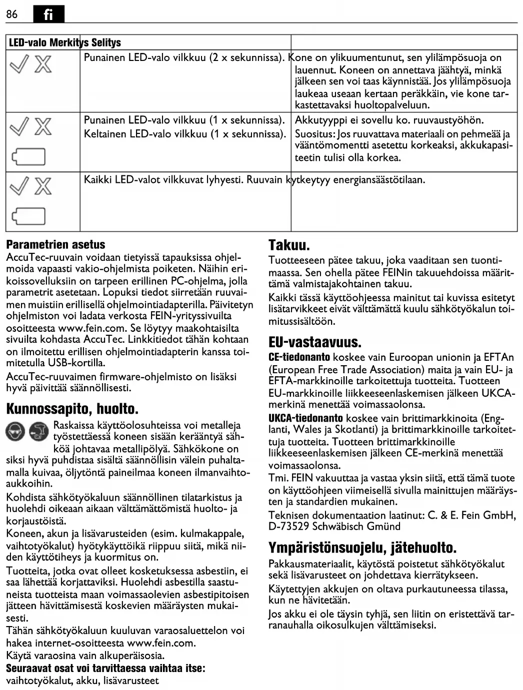 Jótállás és szavatosság. A termékre vonatkozó jótállás a forgalomba hozási országban hatályos törvényes rendelkezéseknek megfelelően érvényes. Termékeinket ezen túlmenően a FEIN jótállási nyilatkozatában leírtaknak megfelelő kiterjesztett garanciával szállítjuk. Az elektromos kéziszerszám szállítási terjedelmében lehet, hogy az ezen kezelési útmutatóban leírásra vagy ábrázolásra került tartozékoknak csak egy része található meg. Megfelelőségi nyilatkozat. A CE-nyilatkozat csak az Európai Unió és az EFTA (Európai Szabadkereskedelmi Társulás) országaira és csak azokra a termékekre érvényes, amelyek az EU- vagy EFTA-piac számára kerültek gyártásra. A terméknek az EU-piacon való forgalombahozatala után az UKCA-jel érvényét veszti. Az UKCA-nyilatkozat csak a brit piacra (Angliára, Walesre és Skóciára) és csak azokra a termékekre vonatkozik, amelyek a brit piac számára kerültek gyártásra. A terméknek a brit piacon való forgalombahozatala után a CE-jel érvényét veszti. A FEIN egyedüli felelőséggel kijelenti, hogy ez a termék megfelel az ezen kezelési útmutató utolsó oldalán megadott idevonatkozó előírásoknak. A műszaki dokumentáció a következő helyen található: C. & E. Fein GmbH, D-73529 Schwäbisch Gmünd Környezetvédelem, hulladékkezelés. A csomagolásokat, a selejtes elektromos kéziszerszámokat és tartozékokat a környezetvédelmi szempontoknak megfelelően kell újra felhasználni. Az akkumulátorokat csak kisütött állapotban adja le a megfelelő ártalmatlanításra. Nem teljesen kisütött akkumulátorok esetén elővigyázatosságból, rövidzárlatok megakadályozására a csatlakozókat szigetelőszalaggal szigetelje le.93