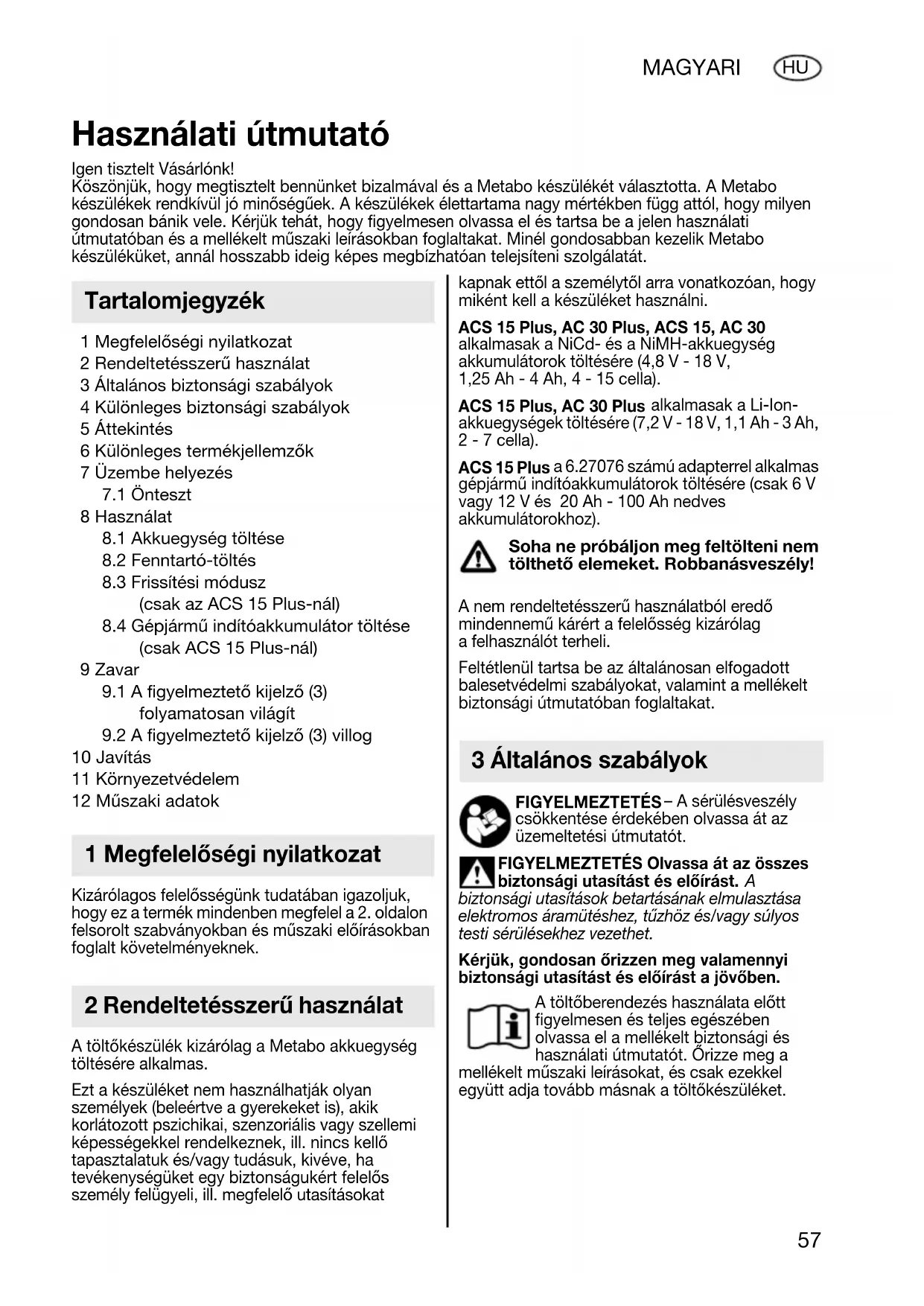biztonsági utasítások betartásának elmulasztása elektromos áramütéshez, tűzhöz és/vagy súlyos testi sérülésekhez vezethet. Kérjük, gondosan őrizzen meg valamennyi biztonsági utasítást és előírást a jövőben. A töltőberendezés használata előtt figyelmesen és teljes egészében olvassa el a mellékelt biztonsági és használati útmutatót. Őrizze meg a mellékelt műszaki leírásokat, és csak ezekkel együtt adja tovább másnak a töltőkészüléket. Használati útmutató Igen tisztelt Vásárlónk! Köszönjük, hogy megtisztelt bennünket bizalmával és a Metabo készülékét választotta. A Metabo készülékek rendkívül jó minőségűek. A készülékek élettartama nagy mértékben függ attól, hogy milyen gondosan bánik vele. Kérjük tehát, hogy figyelmesen olvassa el és tartsa be a jelen használati útmutatóban és a mellékelt műszaki leírásokban foglaltakat. Minél gondosabban kezelik Metabo készüléküket, annál hosszabb ideig képes megbízhatóan telejsíteni szolgálatát. Tartalomjegyzék 1 Megfelelőségi nyilatkozat 2 Rendeltetésszerű használat 3 Általános szabályok 17024963_0309 ACS 15 AC 30.book Seite 57 Mittwoch, 4. März 2009 4:29 1658 MAGYAR