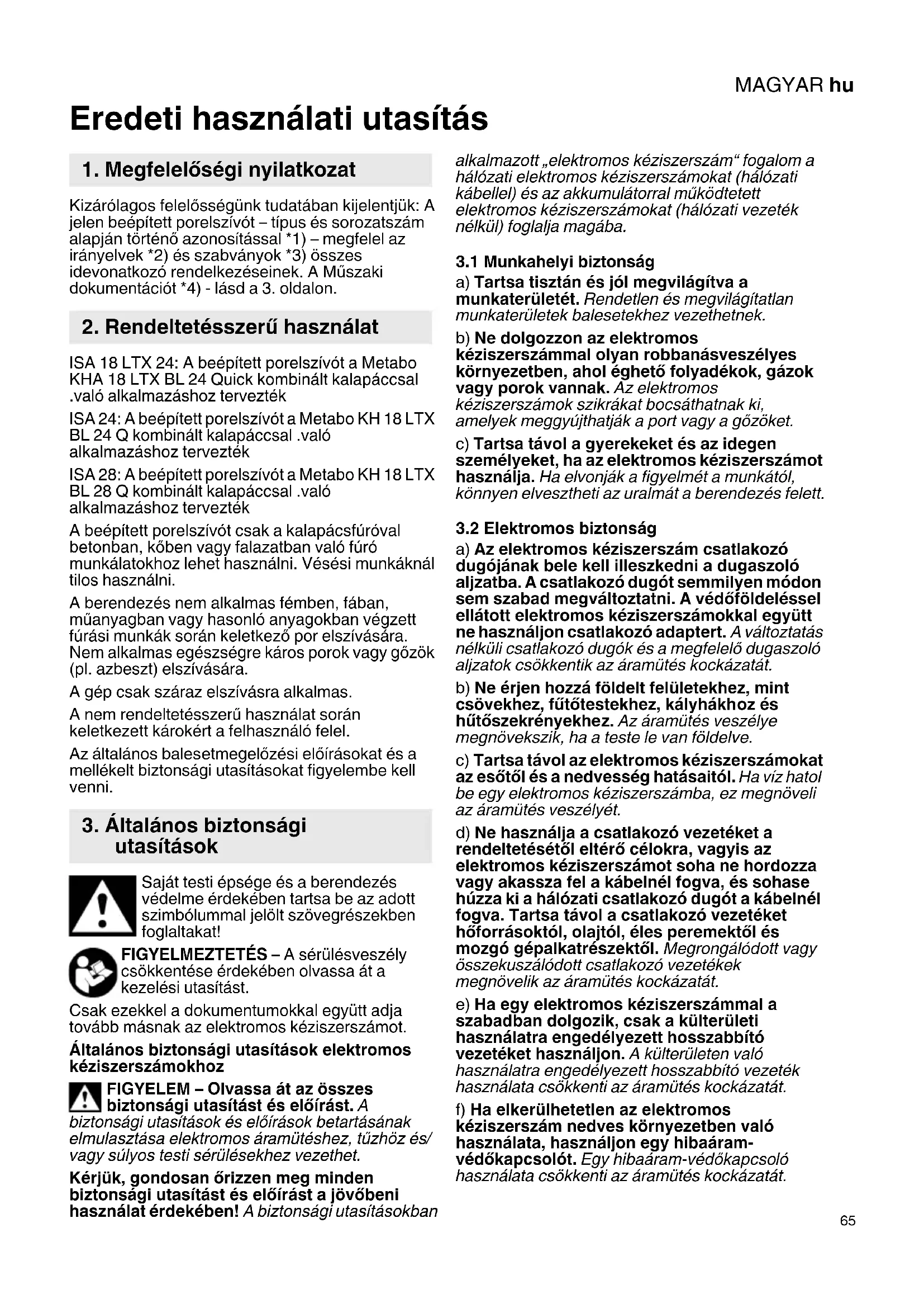 Eredeti használati utasítás Kizárólagos felelősségünk tudatában kijelentjük: A jelen beépített porelszívót – típus és sorozatszám alapján történő azonosítással *1) – megfelel az irányelvek *2) és szabványok *3) összes idevonatkozó rendelkezéseinek. A Műszaki dokumentációt *4) - lásd a 3. oldalon. ISA 18 LTX 24: A beépített porelszívót a Metabo KHA 18 LTX BL 24 Quick kombinált kalapáccsal .való alkalmazáshoz tervezték ISA 24: A beépített porelszívót a Metabo KH 18 LTX BL 24 Q kombinált kalapáccsal .való alkalmazáshoz tervezték ISA 28: A beépített porelszívót a Metabo KH 18 LTX BL 28 Q kombinált kalapáccsal .való alkalmazáshoz tervezték A beépített porelszívót csak a kalapácsfúróval betonban, kőben vagy falazatban való fúró munkálatokhoz lehet használni. Vésési munkáknál tilos használni. A berendezés nem alkalmas fémben, fában, műanyagban vagy hasonló anyagokban végzett fúrási munkák során keletkező por elszívására. Nem alkalmas egészségre káros porok vagy gőzök (pl. azbeszt) elszívására. A gép csak száraz elszívásra alkalmas. A nem rendeltetésszerű használat során keletkezett károkért a felhasználó felel. Az általános balesetmegelőzési előírásokat és a mellékelt biztonsági utasításokat figyelembe kell venni. Saját testi épsége és a berendezés védelme érdekében tartsa be az adott szimbólummal jelölt szövegrészekben foglaltakat! FIGYELMEZTETÉS – A sérülésveszély csökkentése érdekében olvassa át a kezelési utasítást. Csak ezekkel a dokumentumokkal együtt adja tovább másnak az elektromos kéziszerszámot. Általános biztonsági utasítások elektromos kéziszerszámokhoz FIGYELEM – Olvassa át az összes biztonsági utasítást és előírást. A biztonsági utasítások és előírások betartásának elmulasztása elektromos áramütéshez, tűzhöz és/ vagy súlyos testi sérülésekhez vezethet. Kérjük, gondosan őrizzen meg minden biztonsági utasítást és előírást a jövőbeni használat érdekében! A biztonsági utasításokban alkalmazott „elektromos kéziszerszám“ fogalom a hálózati elektromos kéziszerszámokat (hálózati kábellel) és az akkumulátorral működtetett elektromos kéziszerszámokat (hálózati vezeték nélkül) foglalja magába.