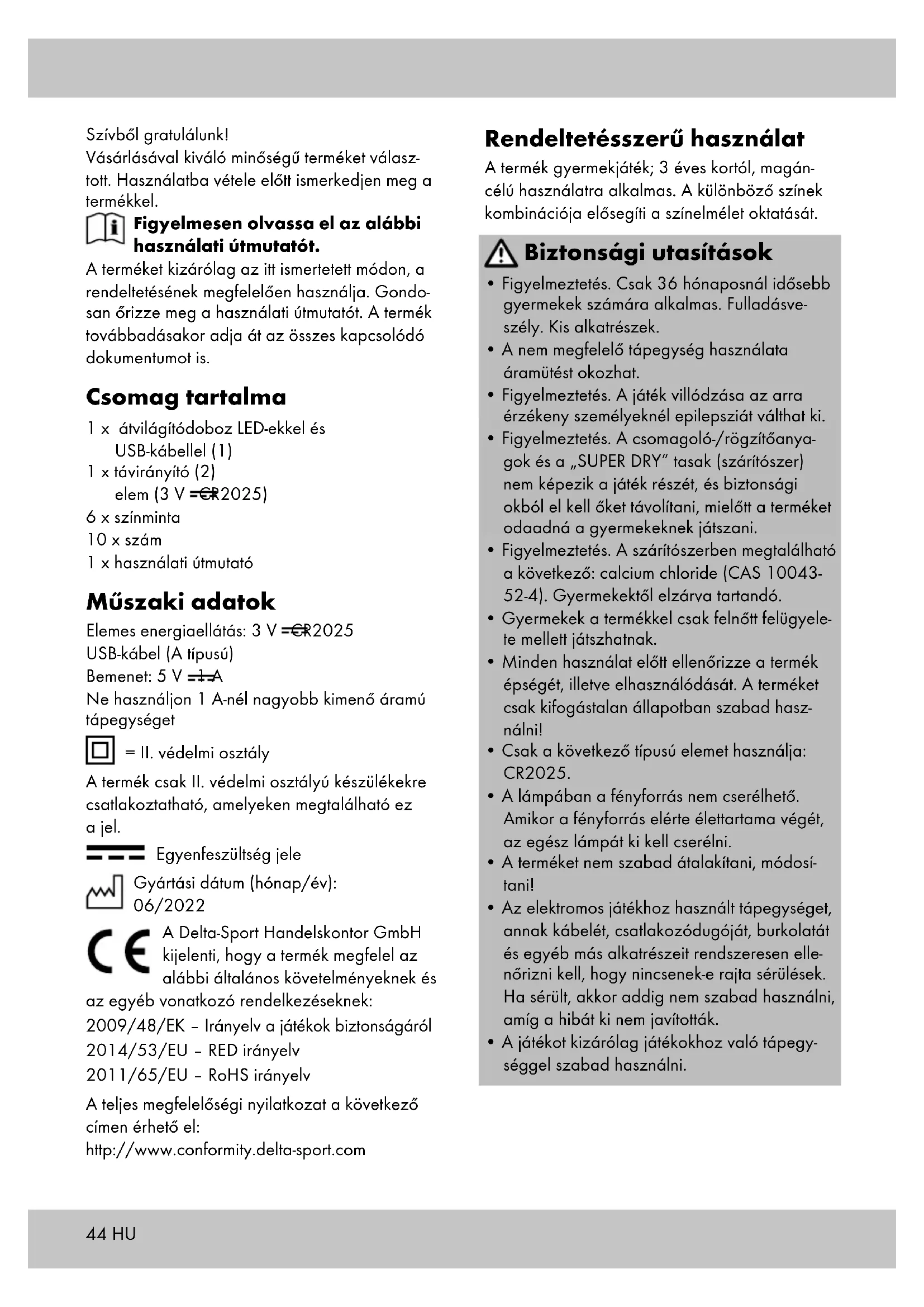 - DEMO (2l): a gomb megnyomásával a külön- böző fényhatások bemutatását indíthatja el. Játék A játék célja, hogy a különböző színmintáknak a bekapcsolt termékre (1) történő felhelye- zésével azok változását megfigyeljük, a fény intenzitásának, ritmusának és a színkombináció- nak megfelelően. A színes számok segítségével a számok és a színek megértése játékos módon kombinálható és megtapasztalható. Tárolás, tisztítás A terméket mindig száraz, tiszta és szobahő- mérsékletű helyen tárolja elemek nélkül, ha azt nem használja. Csak törölje tisztára egy száraz törlőkendővel. FONTOS! Ne használjon éles tisztítószereket a tisztításhoz. A terméket a zsinórfülnél (1c) fogva szállítsa. Tudnivalók a hulladékkeze- lésről Kiszolgált termékét a környezet védelme érdekében ne dobja a háztartási hulladékok közé, hanem egy szakszerű gyűjtőhelyen adja le. A gyűjtőhelyekről és azok nyitvatartási idejéről az illetékes önkormányzatnál tájékozódhat. A hibás vagy elhasznált elemeket/akkumuláto- rokat a 2006/66/EK és azok módosításai által leírtaknak megfelelően kell újrahasznosítani. Az elemeket/akkumulátorokat és/vagy termékeket a felajánlott gyűjtőhelyeken adja le. A csomago- lóanyag, pl. a fóliazsák gyerekek kezébe nem való. A csomagolóanyagot gyerekek számára nem elérhető helyen tárolja. A hulladékká vált elemek/akkumulátorok hibás kezelése környezeti károkat okozhat! Az elemeket/akkumulátorokat tilos a háztartási hulladékokkal együtt kidobni. Ugyanis mérgező nehézfémeket tartalmazhatnak, ami a különleges hulladékkeze- léshez tartozik. A nehézfémek vegyjelei: Cd = kadmium, Hg = higany, Pb = ólom. Ezért a használt elemeket/akkumulátorokat a községi gyűjtőhelyen adja le. A terméket környezetbarát módon selejtezze le. A szelektív hulladékgyűjtés során vegye figyelembe a csomagolóanyagokon lévő jelzéseket, ahol a rövidítések (a) és számok (b) jelentése: 1–7: műanyagok/20–22: papír és karton/80–98: kötőanyagok. A termékek és a csomagolóanyagok újrahaszno- síthatók, ezért a jobb hulladékkezelés érdeké- ben külön gyűjtse ezeket. A Triman logó csak Franciaországban érvényes. A kiszolgált termék hulladékkezelési lehetőségeiről a községi és városi önkormányzatnál tájékozódhat. A garanciával és a szerviz lebonyolításával kapcsolatos útmutató A termék nagy gondossággal és állandó ellenőr- zés mellett készült. A DELTA-SPORT HANDELS- KONTOR GmbH privát végső felhasználóknak a vásárlás dátumától számított három év (garancia időtartama) garanciát ad erre a termékre a kö- vetkező rendelkezések szerint. A garancia csak anyaghibára és feldolgozási hibára érvényes.47HU A garancia nem terjed ki a szokásos elhasználó- dásnak kitett, ezért kopó alkatrésznek tekintendő alkatrészekre (pl. elemek), valamint a törékeny alkatrészekre sem, például a kapcsolókra, az akkumulátorokra vagy az üvegből készült alkatrészekre. Kizárásra kerül a garanciaigény, ha a terméket szakszerűtlenül vagy helytelenül, nem rendel- tetésszerűen vagy nem az előirányzott felhasz- nálási körben használták, vagy figyelmen kívül hagyták a kezelési útmutató előírásait, kivéve, ha a végső felhasználó bizonyítja, hogy olyan anyag- vagy feldolgozási hiba áll fenn, amely nem a fent említett körülmények valamelyikéből ered. A garanciaigény csak a garancia időtartamán belül, az eredeti pénztári bizonylat bemutatásá- val érvényesíthető. Ezért kérjük, őrizze meg az eredeti pénztári bizonylatot. A garancia, a tör- vényes garancia vagy a méltányosság alapján végzett esetleges javítások a garancia időtar- tamát nem hosszabbítják meg. Ez vonatkozik a kicserélt és javított alkatrészekre is. Kérjük, hogy reklamáció esetén először az aláb- bi szervizvonalat hívja, vagy e-mailen keressen minket. Garanciális esetekben a terméket saját döntésünk alapján ingyenesen megjavítjuk, kicseréljük vagy megtérítjük a vételárat. A garan- ciából további jogok nem következnek. A jelen garancia nem korlátozza az Ön törvé- nyes jogait, különösen a mindenkori értékesítővel szembeni garanciaigényét. IAN: 389693_2201 Szerviz Magyarország Tel.: 06800 21225 E-Mail: deltasport@lidl.hu48 SI Čestitamo! Z nakupom ste se odločili za visokokakovos- ten izdelek. Pred prvo uporabo se seznanite z izdelkom. V ta namen natančno preberite naslednje navodilo za uporabo. Izdelek uporabljajte, kot je opisano, in za navedena področja uporabe. To navodilo za uporabo skrbno hranite. Če boste izdelek predali tretjim osebam, zraven priložite vso dokumentacijo. Obseg dobave 1 x svetlobna škatla z lučkami LED in kablom USB (1) 1 x daljinski upravljalnik (2) vklj. baterija (3 V CR2025) 6 x barvna šablona 10 x številka 1 x navodilo za uporabo Tehnični podatki Baterijsko napajanje: 3 V CR2025 Kabel USB (tip A) Vhod: 5 V 1 A Ne uporabljajte napajalnikov z jakostjo izhodnega toka > 1 A = razred zaščite II Ta izdelek je dovoljeno priključiti le na naprave z razredom zaščite II, na katerih je prisoten ta simbol. Simbol za enosmerno napetost Datum izdelave (mesec/leto): 06/2022 Delta-Sport Handelskontor GmbH izjavlja, da je ta izdelek skladen z naslednjimi temeljnimi zahtevami in drugimi ustreznimi določbami: 2009/48/EU – Direktiva o varnosti igrač 2014/53/EU – Direktiva o radijski opremi 2011/65/EU – Direktiva RoHS Celotne izjave o skladnosti so na voljo na spletnem mestu: http://www.conformity.delta-sport.com Predvidena uporaba Ta izdelek je igrača za otroke, starejše od 3 let, in je namenjen za zasebno uporabo. Kombinaci- ja različnih barv omogoča učenje barv. Varnostni napotki