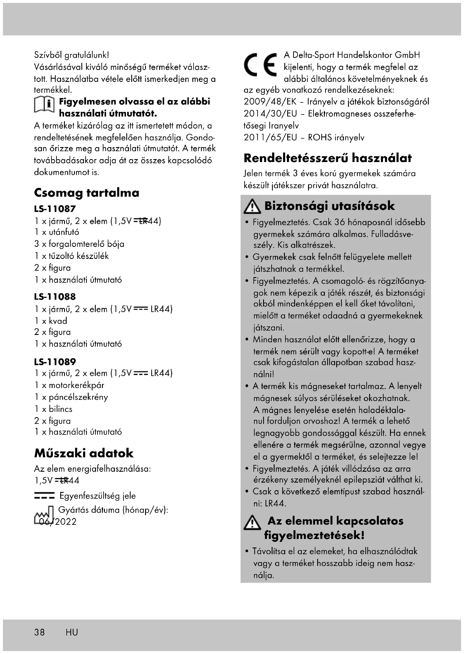 a csavarral a termék alján. Tárolás, tisztítás A terméket mindig száraz, tiszta és szobahőmér- sékletű helyen tárolja elemek nélkül, ha azt nem használja. Csak törölje tisztára egy száraz ronggyal. FONTOS! Ne használjon éles tisztítószereket a tisztításhoz. Tudnivalók a hulladékkezelésről Kiszolgált termékét a környezet védelme érdekében ne dobja a háztartási hulladékok közé, hanem egy szakszerű gyűjtőhelyen adja le. A gyűjtőhelyekről és azok nyitvatartási idejéről az illetékes önkormányzatnál tájékozódhat. A hibás vagy elhasznált elemeket/ akkumulátorokat a 2006/66/EK és azok módosításai által leírtaknak megfelelően kell újrahasznosítani.40 Az elemeket/akkumulátorokat és/vagy termékeket a felajánlott gyűjtőhelyeken adja le. A csomagolóanyag, pl. a fóliazsák gyerekek kezébe nem való. A csomagolóanyagot gyerekek számára nem elérhető helyen tárolja. A hulladékká vált elemek/akkumulátorok hibás kezelése környezeti károkat okozhat! Az elemeket/akkumulátorokat tilos a háztartási hulladékokkal együtt kidobni. Ugyanis mérgező nehézfémeket tartalmazhatnak, ami a különleges hulladékkezeléshez tartozik. A nehézfémek vegyjelei: Cd = kadmium, Hg = higany, Pb = ólom. Ezért a használt elemeket/ akkumulátorokat a községi gyűjtőhelyen adja le. A terméket környezetbarát módon selejtezze le. A szelektív hulladékgyűjtés során vegye figyelembe a csomagolóanyagokon lévő jelzéseket, ahol a rövidítések (a) és számok (b) jelentése: 1–7: műanyagok/ 20–22: papír és karton/80–98: kötőanyagok. A termékek és a csomagolóanyagok újrahasznosíthatók, ezért a jobb hulladékkezelés érdekében külön gyűjtse ezeket. A Triman logó csak Franciaországban érvényes. A kiszolgált termék hulladékkezelési lehetőségeiről a községi és városi önkormányzatnál tájékozódhat. A garanciával és a szerviz lebonyolításával kapcsolatos útmutató A termék nagy gondossággal és állandó ellenőr- zés mellett készült. A DELTA-SPORT HANDELS- KONTOR GmbH privát végső felhasználóknak a vásárlás dátumától számított három év (garancia időtartama) garanciát ad erre a termékre a kö- vetkező rendelkezések szerint. A garancia csak anyaghibára és feldolgozási hibára érvényes. A garancia nem terjed ki a szokásos elhasználó- dásnak kitett, ezért kopó alkatrésznek tekintendő alkatrészekre (pl. elemek), valamint a törékeny alkatrészekre sem, például a kapcsolókra, az akkumulátorokra vagy az üvegből készült alkatrészekre. Kizárásra kerül a garanciaigény, ha a terméket szakszerűtlenül vagy helytelenül, nem rendel- tetésszerűen vagy nem az előirányzott felhasz- nálási körben használták, vagy figyelmen kívül hagyták a kezelési útmutató előírásait, kivéve, ha a végső felhasználó bizonyítja, hogy olyan anyag- vagy feldolgozási hiba áll fenn, amely nem a fent említett körülmények valamelyikéből ered. A garanciaigény csak a garancia időtartamán belül, az eredeti pénztári bizonylat bemutatásá- val érvényesíthető. Ezért kérjük, őrizze meg az eredeti pénztári bizonylatot. A garancia, a tör- vényes garancia vagy a méltányosság alapján végzett esetleges javítások a garancia időtar- tamát nem hosszabbítják meg. Ez vonatkozik a kicserélt és javított alkatrészekre is. Kérjük, hogy reklamáció esetén először az aláb- bi szervizvonalat hívja, vagy e-mailen keressen minket. Garanciális esetekben a terméket saját döntésünk alapján ingyenesen megjavítjuk, kicseréljük vagy megtérítjük a vételárat. A garan- ciából további jogok nem következnek. A jelen garancia nem korlátozza az Ön törvé- nyes jogait, különösen a mindenkori értékesítővel szembeni garanciaigényét. IAN: 391023_2201 Szerviz Magyarország Tel.: 06800 21225 E-Mail: deltasport@lidl.hu HU41SI Čestitamo! Z nakupom ste se odločili za visokokakovos- ten izdelek. Pred prvo uporabo se seznanite z izdelkom. V ta namen natančno preberite naslednje navodilo za uporabo. Izdelek uporabljajte, kot je opisano, in za navedena področja uporabe. To navodilo za uporabo skrbno hranite. Če boste izdelek predali tretjim osebam, zraven priložite vso dokumentacijo. Obseg dobave LS-11087 1 x vozilo vklj. 2 x baterija (1,5V LR44) 1 x prikolica 3 x pilon 1 x gasilni aparat 2 x figurica 1 x navodilo za uporabo LS-11088 1 x vozilo vklj. 2 x baterija (1,5V LR44) 1 x štirikolesnik 2 x figurica 1 x navodilo za uporabo LS-11089 1 x vozilo vklj. 2 x baterija (1,5V LR44) 1 x motorno kolo 1 x trezor 1 x lisice 2 x figurica 1 x navodilo za uporabo Tehnični podatki Energetsko napajanje baterije: 1,5V LR44 Simbol za enosmerno napetost Datum izdelave (mesec/leto): 06/2022 Delta-Sport Handelskontor GmbH izjavlja, da je ta izdelek skladen z naslednjimi temeljnimi zahtevami in drugimi ustreznimi določbami: 2009/48/ES – Direktiva o varnosti igrač 2014/30/EU – Direktiva EMC 2011/65/EU – Direktiva RoHS Namenska uporaba Ta izdelek je igrača za otroke od 3. leta dalje za zasebno uporabo. Varnostna opozorila
