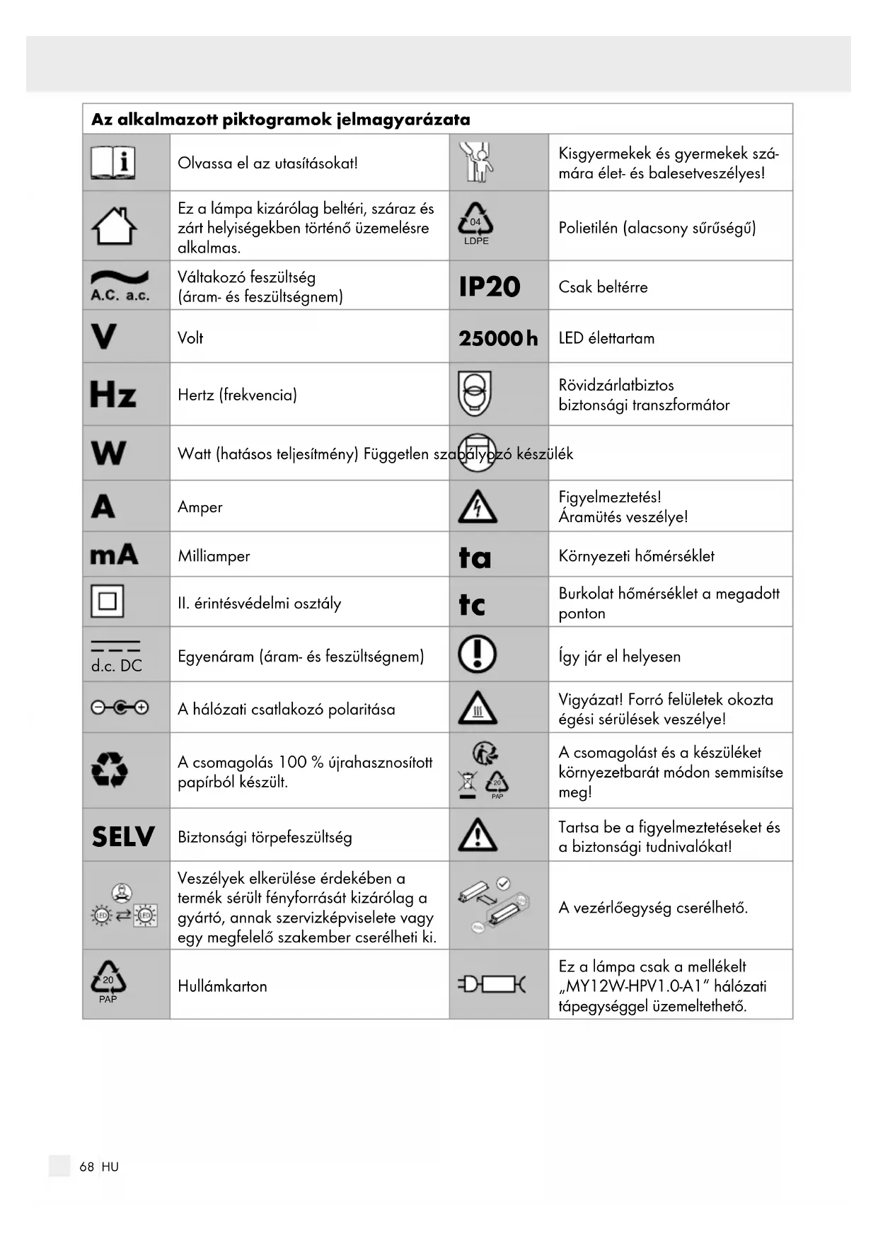 PAP A csomagolást és a készüléket környezetbarát módon semmisítse meg! SELV Biztonsági törpefeszültség Tartsa be a figyelmeztetéseket és a biztonsági tudnivalókat! Veszélyek elkerülése érdekében a termék sérült fényforrását kizárólag a gyártó, annak szervizképviselete vagy egy megfelelő szakember cserélheti ki. A vezérlőegység cserélhető.