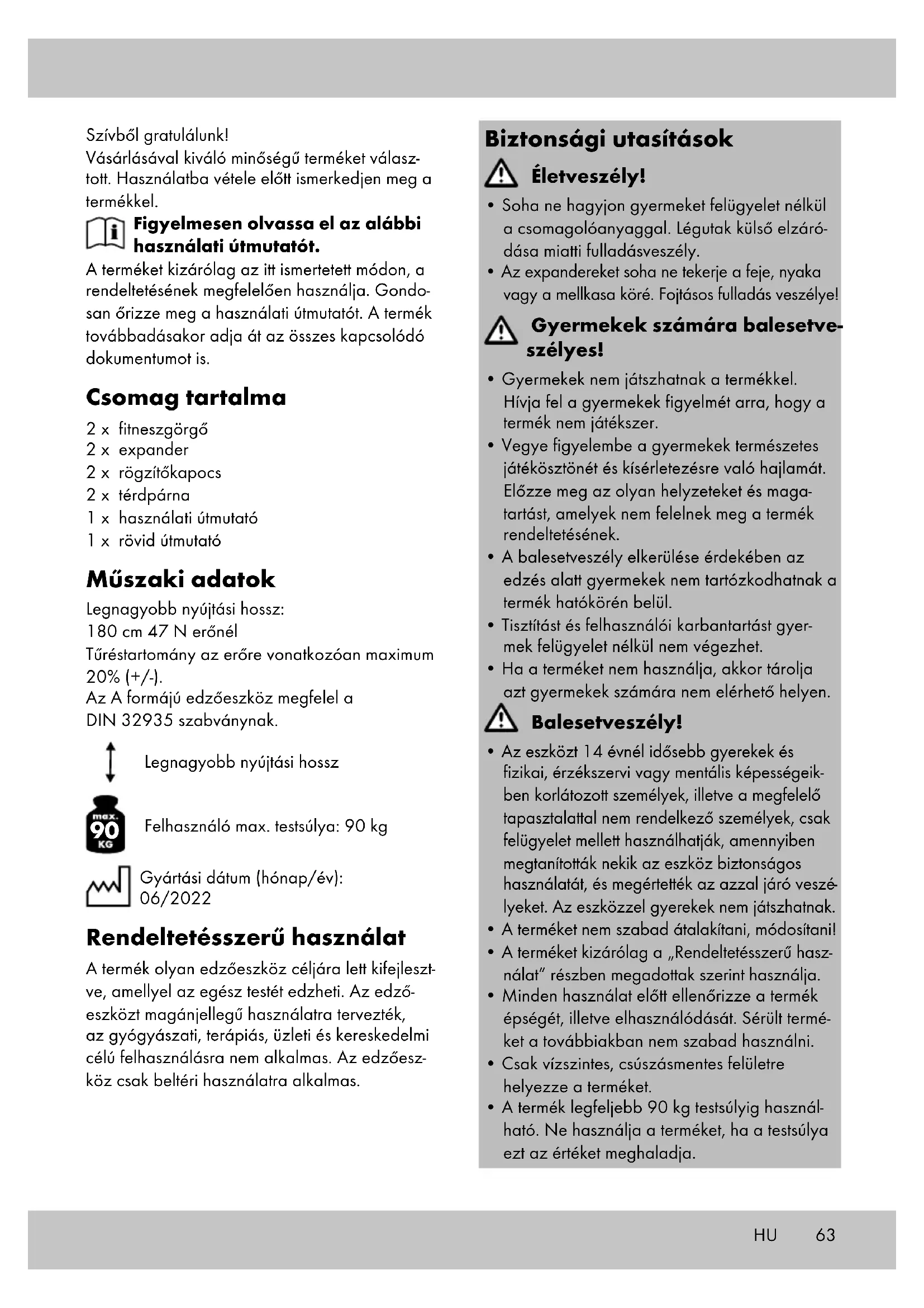 Felhasználó max. testsúlya: 90 kg Gyártási dátum (hónap/év): 06/2022 Rendeltetésszerű használat A termék olyan edzőeszköz céljára lett kifejleszt- ve, amellyel az egész testét edzheti. Az edző- eszközt magánjellegű használatra tervezték, az gyógyászati, terápiás, üzleti és kereskedelmi célú felhasználásra nem alkalmas. Az edzőesz- köz csak beltéri használatra alkalmas.64