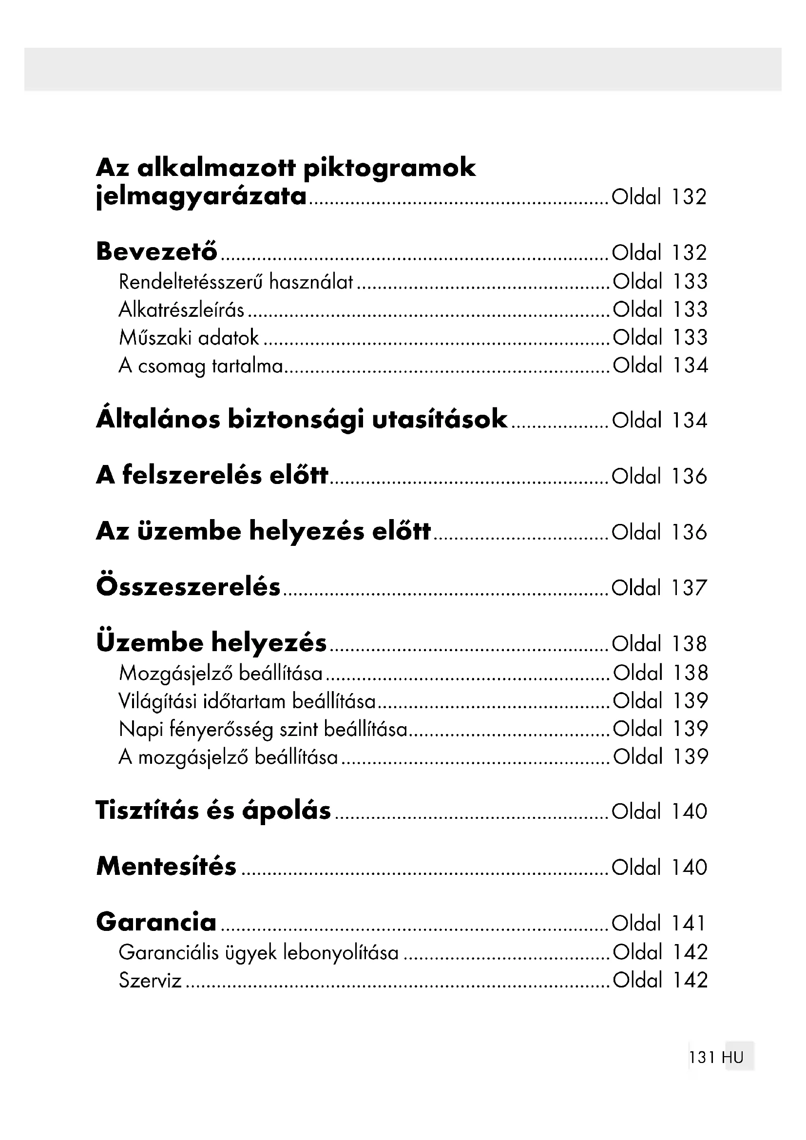 Szerelési magasság: kb. 2,5 m134 HU Súly: kb. 305 g GS által tanúsított A jelen termék „F“ energiahatékonysági osztályú fényforrást tartalmaz. A csomag tartalma 1 LED-es külső fényszóró mozgásjelzővel 2 tipli (Ø 6 mm) 2 csavar 1 szerelési- és használati útmutató Általános biztonsági utasítások A termék első használata előtt ismerje meg valamennyi használati és biztonsági utasítást. A termék harmadik félnek történő továbbadása esetén adja át a teljes dokumentációt is.