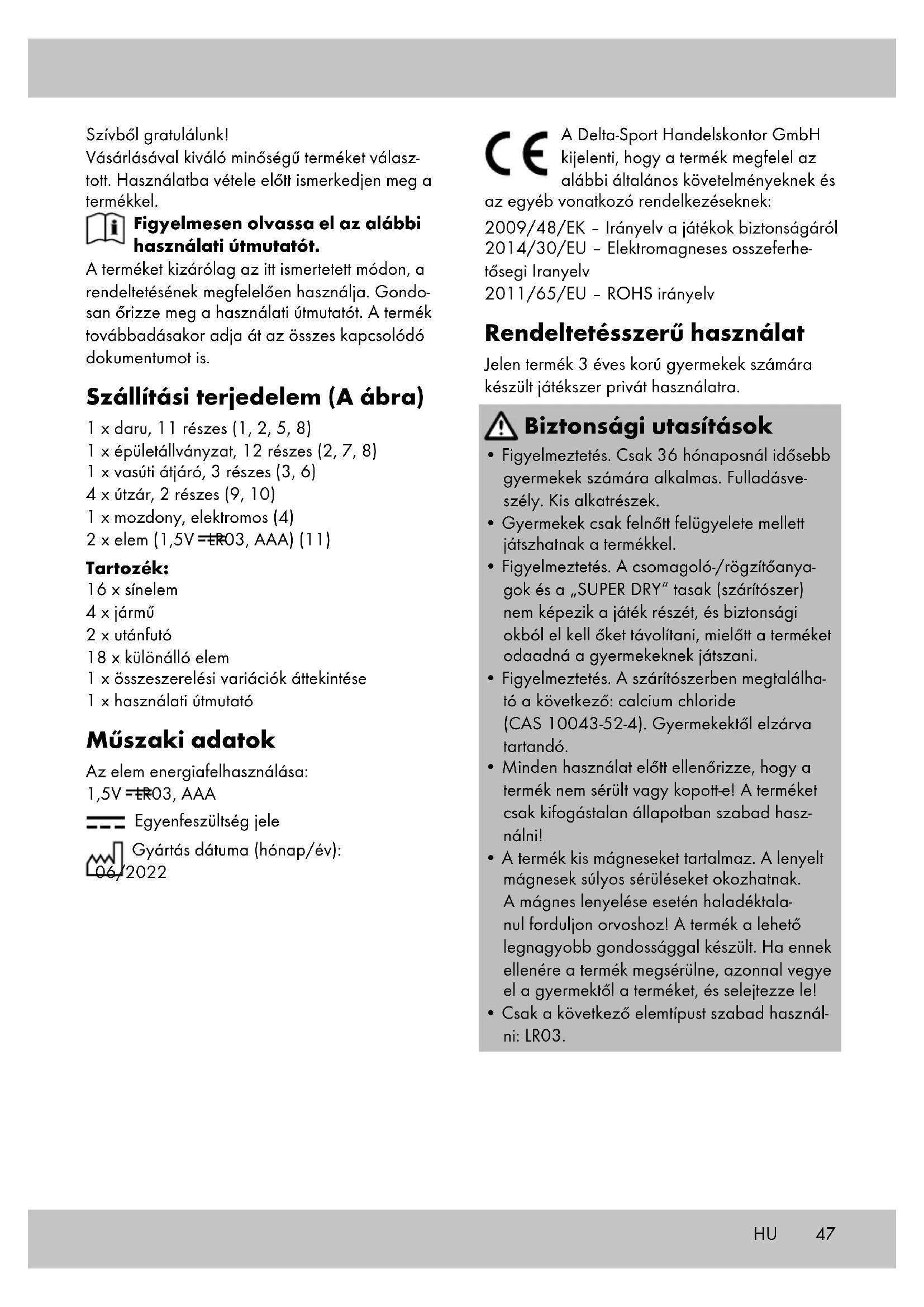 Egyenfeszültség jele Gyártás dátuma (hónap/év): 06/2022 A Delta-Sport Handelskontor GmbH kijelenti, hogy a termék megfelel az alábbi általános követelményeknek és az egyéb vonatkozó rendelkezéseknek: 2009/48/EK – Irányelv a játékok biztonságáról 2014/30/EU – Elektromagneses osszeferhe- tősegi Iranyelv 2011/65/EU – ROHS irányelv Rendeltetésszerű használat Jelen termék 3 éves korú gyermekek számára készült játékszer privát használatra. Biztonsági utasítások