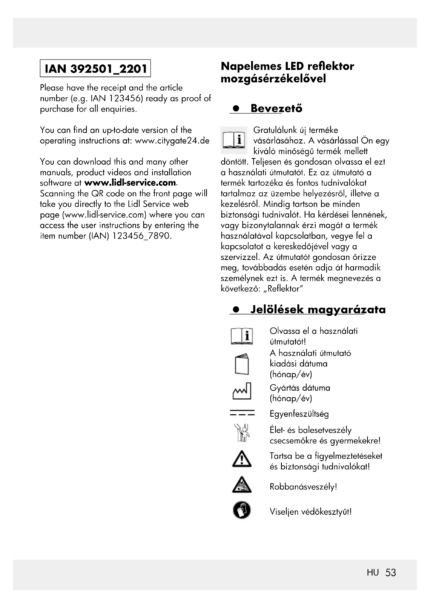 Scanning the QR code on the front page will take you directly to the Lidl Service web page (www.lidl-service.com) where you can access the user instructions by entering the item number (IAN) 123456_7890. Napelemes LED reektor mozgásérzékelővel z Bevezető Gratulálunk új terméke vásárlásához. A vásárlással Ön egy kiváló minőségű termék mellett döntött. Teljesen és gondosan olvassa el ezt a használati útmutatót. Ez az útmutató a termék tartozéka és fontos tudnivalókat tartalmaz az üzembe helyezésről, illetve a kezelésről. Mindig tartson be minden biztonsági tudnivalót. Ha kérdései lennének, vagy bizonytalannak érzi magát a termék használatával kapcsolatban, vegye fel a kapcsolatot a kereskedőjével vagy a szervizzel. Az útmutatót gondosan őrizze meg, továbbadás esetén adja át harmadik személynek ezt is. A termék megnevezés a következő: „Reektor” z Jelölések magyarázata Olvassa el a használati útmutatót! A használati útmutató kiadási dátuma (hónap/év) Gyártás dátuma (hónap/év) Egyenfeszültség Élet- és balesetveszély csecsemőkre és gyermekekre! Tartsa be a gyelmeztetéseket és biztonsági tudnivalókat! Robbanásveszély! Viseljen védőkesztyűt!54