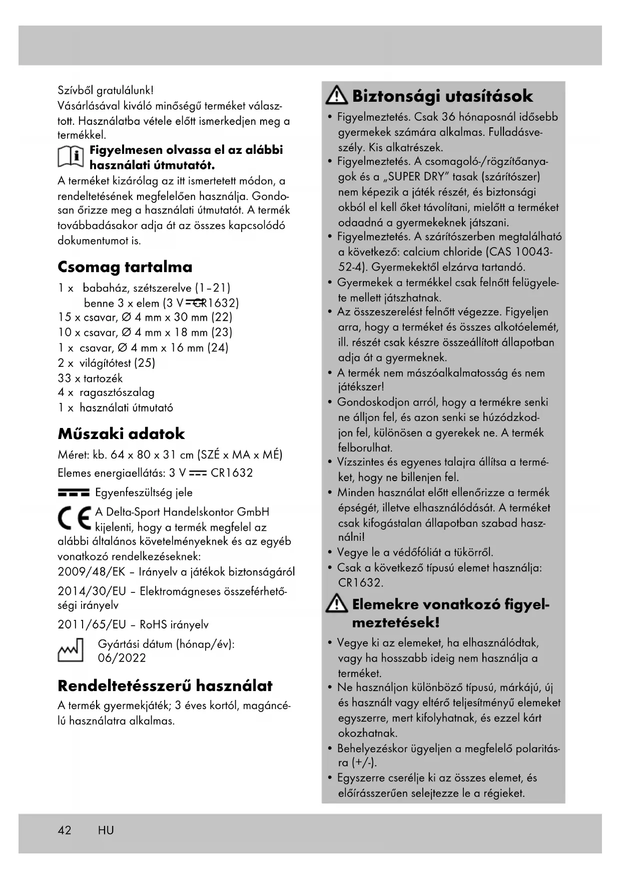 tótest (25) fedelét. Rögzítse a csengőt a babaházra. Tárolás, tisztítás A terméket mindig száraz, tiszta és szobahő- mérsékletű helyen tárolja elemek nélkül, ha azt nem használja. Csak törölje tisztára egy száraz törlőkendővel. A textíliákat csak hideg víz alatt tisztítsa, és hagyja szobahőmérsékleten megszáradni. FONTOS! Ne használjon éles tisztítószereket a tisztításhoz. HU44 Tudnivalók a hulladékkeze- lésről Kiszolgált termékét a környezet védelme érdekében ne dobja a háztartási hulladékok közé, hanem egy szakszerű gyűjtőhelyen adja le. A gyűjtőhelyekről és azok nyitvatartási idejéről az illetékes önkormányzatnál tájékozódhat. A hibás vagy elhasznált elemeket/akkumuláto- rokat a 2006/66/EK és azok módosításai által leírtaknak megfelelően kell újrahasznosítani. Az elemeket/akkumulátorokat és/vagy termékeket a felajánlott gyűjtőhelyeken adja le. A csomago- lóanyag, pl. a fóliazsák gyerekek kezébe nem való. A csomagolóanyagot gyerekek számára nem elérhető helyen tárolja. A hulladékká vált elemek/akkumulátorok hibás kezelése környezeti károkat okozhat! Az elemeket/akkumulátorokat tilos a háztartási hulladékokkal együtt kidobni. Ugyanis mérgező nehézfémeket tartalmazhatnak, ami a különleges hulladékkeze- léshez tartozik. A nehézfémek vegyjelei: Cd = kadmium, Hg = higany, Pb = ólom. Ezért a használt elemeket/akkumulátorokat a községi gyűjtőhelyen adja le. A terméket környezetbarát módon selejtezze le. A szelektív hulladékgyűjtés során vegye figyelembe a csomagolóanyagokon lévő jelzéseket, ahol a rövidítések (a) és számok (b) jelentése: 1–7: műanyagok/ 20–22: papír és karton/80–98: kötőanyagok. A termékek és a csomagolóanyagok újrahaszno- síthatók, ezért a jobb hulladékkezelés érdeké- ben külön gyűjtse ezeket. A Triman logó csak Franciaországban érvényes. A kiszolgált termék hulladékkezelési lehetőségeiről a községi és városi önkormányzatnál tájékozódhat. A garanciával és a szerviz lebonyolításával kapcsolatos útmutató A termék nagy gondossággal és állandó ellenőr- zés mellett készült. A DELTA-SPORT HANDELSKONTOR GmbH privát végső felhasz- nálóknak a vásárlás dátumától számított három év (garancia időtartama) garanciát ad erre a termékre a következő rendelkezések szerint. A garancia csak anyaghibára és feldolgozási hibára érvényes. A garancia nem terjed ki a szokásos elhasználódásnak kitett, ezért kopó al- katrésznek tekintendő alkatrészekre (pl. elemek), valamint a törékeny alkatrészekre sem, például a kapcsolókra, az akkumulátorokra vagy az üvegből készült alkatrészekre. Kizárásra kerül a garanciaigény, ha a terméket szakszerűtlenül vagy helytelenül, nem rendel- tetésszerűen vagy nem az előirányzott felhasz- nálási körben használták, vagy figyelmen kívül hagyták a kezelési útmutató előírásait, kivéve, ha a végső felhasználó bizonyítja, hogy olyan anyag- vagy feldolgozási hiba áll fenn, amely nem a fent említett körülmények valamelyikéből ered. A garanciaigény csak a garancia időtartamán belül, az eredeti pénztári bizonylat bemutatásá- val érvényesíthető. Ezért kérjük, őrizze meg az eredeti pénztári bizonylatot. A garancia, a tör- vényes garancia vagy a méltányosság alapján végzett esetleges javítások a garancia időtar- tamát nem hosszabbítják meg. Ez vonatkozik a kicserélt és javított alkatrészekre is. Kérjük, hogy reklamáció esetén először az aláb- bi szervizvonalat hívja, vagy e-mailen keressen minket. Garanciális esetekben a terméket saját döntésünk alapján ingyenesen megjavítjuk, kicseréljük vagy megtérítjük a vételárat. A garan- ciából további jogok nem következnek. A jelen garancia nem korlátozza az Ön törvé- nyes jogait, különösen a mindenkori értékesítővel szembeni garanciaigényét. IAN: 393053_2201 Szerviz Magyarország Tel.: 06800 21225 E-Mail: deltasport@lidl.hu HU45 Čestitamo! Z nakupom ste se odločili za visokokakovos- ten izdelek. Pred prvo uporabo se seznanite z izdelkom. V ta namen natančno preberite naslednje navodilo za uporabo. Izdelek uporabljajte, kot je opisano, in za navedena področja uporabe. To navodilo za uporabo skrbno hranite. Če boste izdelek predali tretjim osebam, zraven priložite vso dokumentacijo. Obseg dobave 1 x hiša za lutke, razstavljena (1–21), vključuje 3 baterije (3 V CR1632) 15 x vijak Ø 4 mm x 30 mm (22) 10 x vijak Ø 4 mm x 18 mm (23) 1 x vijak Ø 4 mm x 16 mm (24) 2 x lučka (25) 33 x pripomočki 4 x lepilni trak 1 x navodilo za uporabo Tehnični podatki Mere: pribl. 64 x 80 x 31 cm (Š x V x G) Baterijsko napajanje: 3 V CR1632 Simbol za enosmerno napetost Delta-Sport Handelskontor GmbH izjavlja, da je ta izdelek skladen z naslednjimi temeljnimi zahtevami in drugimi ustreznimi določbami: 2009/48/ES – Direktiva o varnosti igrač 2014/30/EU – Direktiva EMC 2011/65/EU – Direktiva RoHS Datum izdelave (mesec/leto): 06/2022 Predvidena uporaba Ta izdelek je igrača za otroke, starejše od 3 let, in je namenjen za zasebno uporabo. Varnostni napotki