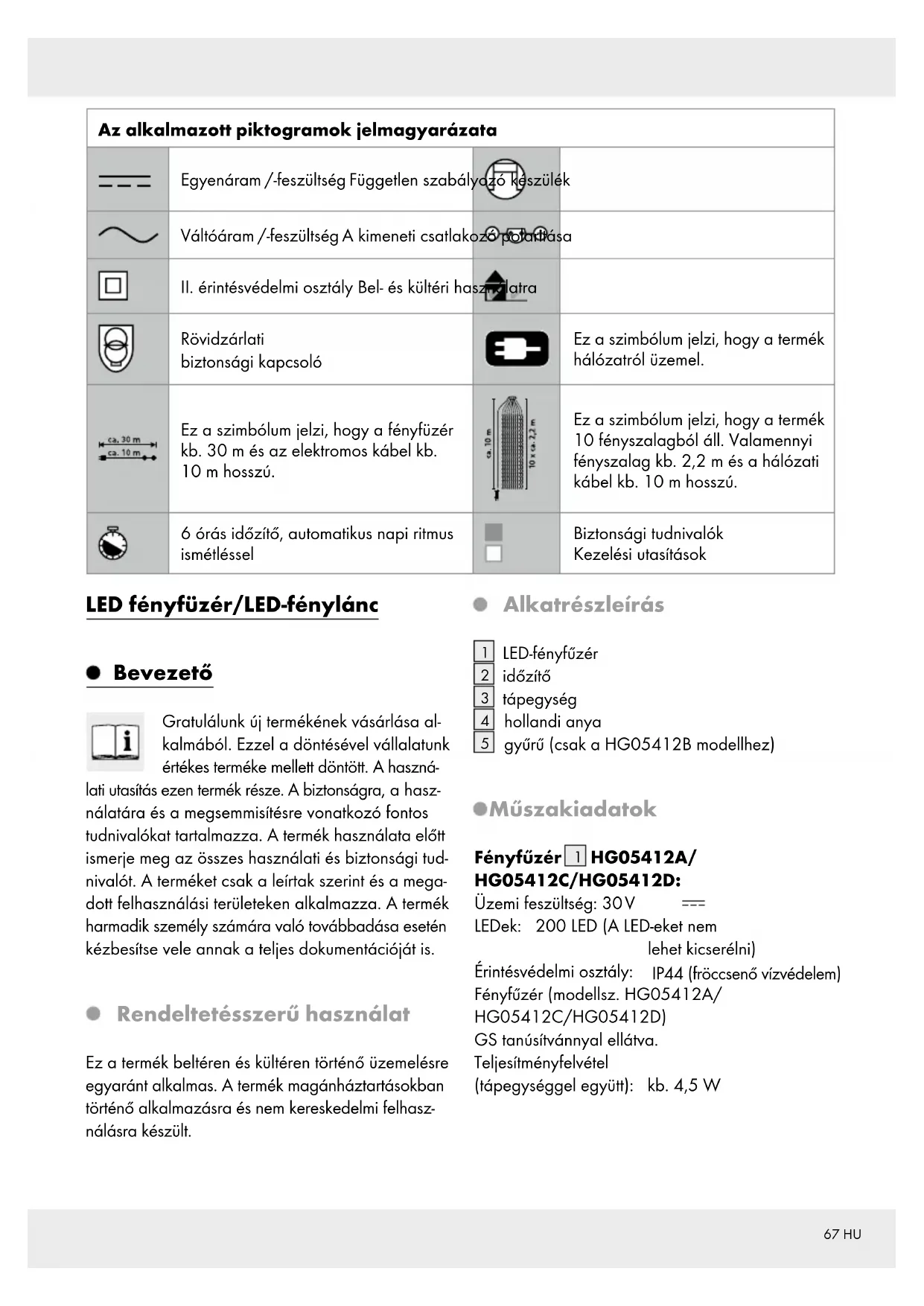 Rövidzárlati biztonsági kapcsoló Ez a szimbólum jelzi, hogy a termék hálózatról üzemel. Ez a szimbólum jelzi, hogy a fényfüzér kb. 30 m és az elektromos kábel kb. 10 m hosszú. Ez a szimbólum jelzi, hogy a termék 10 fényszalagból áll. Valamennyi fényszalag kb. 2,2 m és a hálózati kábel kb. 10 m hosszú. 6 órás időzítő, automatikus napi ritmus ismétléssel Biztonsági tudnivalók Kezelési utasítások LED fényfüzér/LED-fénylánc Bevezető Gratulálunk új termékének vásárlása al- kalmából. Ezzel a döntésével vállalatunk értékes terméke mellett döntött. A haszná- lati utasítás ezen termék része. A biztonságra, a hasz- nálatára és a megsemmisítésre vonatkozó fontos tudnivalókat tartalmazza. A termék használata előtt ismerje meg az összes használati és biztonsági tud- nivalót. A terméket csak a leírtak szerint és a mega- dott felhasználási területeken alkalmazza. A termék harmadik személy számára való továbbadása esetén kézbesítse vele annak a teljes dokumentációját is. Rendeltetésszerű használat Ez a termék beltéren és kültéren történő üzemelésre egyaránt alkalmas. A termék magánháztartásokban történő alkalmazásra és nem kereskedelmi felhasz- nálásra készült. Alkatrészleírás
