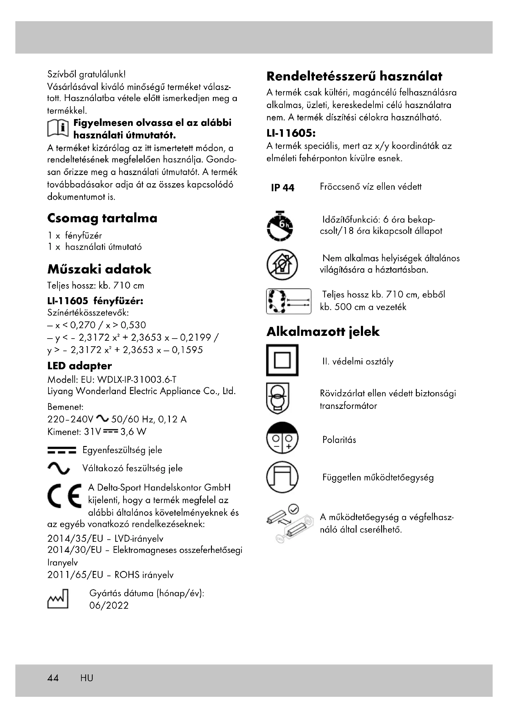 Possibilità di regolazione delle sorgenti luminose L’unità di alimentazione non è adatta per la regolazione delle sorgenti luminose Dimensioni esterne dell’unità di alimentazione Modello: UE: WDLX-IP-31003.6-T – 102 x 41 x 41 mm Modello BS WDLX-31003.6-T – 106 x 49 x 46 mm Peso dell’unità di alimentazione Modello: UE: WDLX-IP-31003.6-T: 50 g Modello BS WDLX- 31003.6-T: 56 g Rimozione dell’unità di alimentazione dall’articolo Estrarre l’unità di alimentazione dalla presa e separarla dall’articolo Possibilità di sorgenti luminose regolabili compatibili L’unità di alimentazione non è adatta per la regolazione delle sorgenti luminose IT44 Szívből gratulálunk! Vásárlásával kiváló minőségű terméket válasz- tott. Használatba vétele előtt ismerkedjen meg a termékkel. Figyelmesen olvassa el az alábbi használati útmutatót. A terméket kizárólag az itt ismertetett módon, a rendeltetésének megfelelően használja. Gondo- san őrizze meg a használati útmutatót. A termék továbbadásakor adja át az összes kapcsolódó dokumentumot is. Csomag tartalma 1 x fényfüzér 1 x használati útmutató Műszaki adatok Teljes hossz: kb. 710 cm LI-11605 fényfüzér: Színértékösszetevők: — x < 0,270 / x > 0,530 — y < – 2,3172 x + 2,3653 x — 0,2199 / y > – 2,3172 x + 2,3653 x — 0,1595 LED adapter Modell: EU: WDLX-IP-31003.6-T Liyang Wonderland Electric Appliance Co., Ltd. Bemenet: 220–240V 50/60 Hz, 0,12 A Kimenet: 31V 3,6 W Egyenfeszültség jele Váltakozó feszültség jele A Delta-Sport Handelskontor GmbH kijelenti, hogy a termék megfelel az alábbi általános követelményeknek és az egyéb vonatkozó rendelkezéseknek: 2014/35/EU – LVD-irányelv 2014/30/EU – Elektromagneses osszeferhetősegi Iranyelv 2011/65/EU – ROHS irányelv Gyártás dátuma (hónap/év): 06/2022 Rendeltetésszerű használat A termék csak kültéri, magáncélú felhasználásra alkalmas, üzleti, kereskedelmi célú használatra nem. A termék díszítési célokra használható. LI-11605: A termék speciális, mert az x/y koordináták az elméleti fehérponton kívülre esnek. IP 44 Fröccsenő víz ellen védett Időzítőfunkció: 6 óra bekap- csolt/18 óra kikapcsolt állapot Nem alkalmas helyiségek általános világítására a háztartásban. Teljes hossz kb. 710 cm, ebből kb. 500 cm a vezeték Alkalmazott jelek