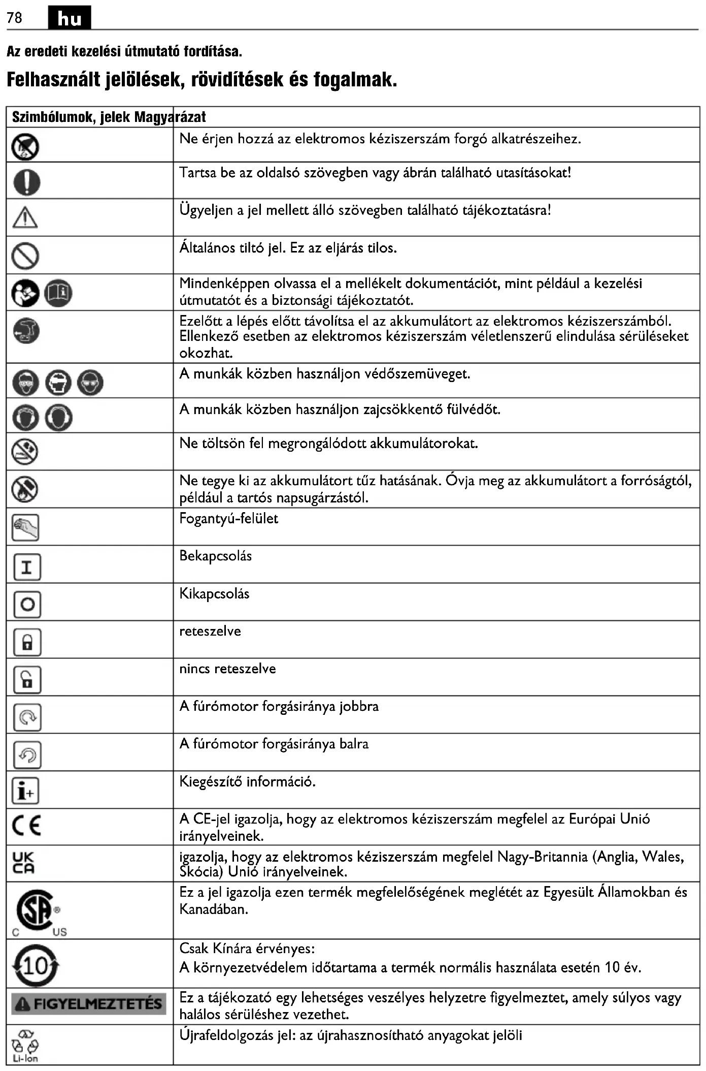 Az eredeti kezelési útmutató fordítása. Felhasznált jelölések, rövidítések és fogalmak. Szimbólumok, jelek Magyarázat Ne érjen hozzá az elektromos kéziszerszám forgó alkatrészeihez. Tartsa be az oldalsó szövegben vagy ábrán található utasításokat! Ügyeljen a jel mellett álló szövegben található tájékoztatásra! Általános tiltó jel. Ez az eljárás tilos. Mindenképpen olvassa el a mellékelt dokumentációt, mint például a kezelési útmutatót és a biztonsági tájékoztatót. Ezelőtt a lépés előtt távolítsa el az akkumulátort az elektromos kéziszerszámból. Ellenkező esetben az elektromos kéziszerszám véletlenszerű elindulása sérüléseket okozhat. A munkák közben használjon védőszemüveget. A munkák közben használjon zajcsökkentő fülvédőt. Ne töltsön fel megrongálódott akkumulátorokat. Ne tegye ki az akkumulátort tűz hatásának. Óvja meg az akkumulátort a forróságtól, például a tartós napsugárzástól. Fogantyú-felület Bekapcsolás Kikapcsolás reteszelve nincs reteszelve A fúrómotor forgásiránya jobbra A fúrómotor forgásiránya balra Kiegészítő információ. A CE-jel igazolja, hogy az elektromos kéziszerszám megfelel az Európai Unió irányelveinek. igazolja, hogy az elektromos kéziszerszám megfelel Nagy-Britannia (Anglia, Wales, Skócia) Unió irányelveinek. Ez a jel igazolja ezen termék megfelelőségének meglétét az Egyesült Államokban és Kanadában. Csak Kínára érvényes: A környezetvédelem időtartama a termék normális használata esetén 10 év. Ez a tájékozató egy lehetséges veszélyes helyzetre figyelmeztet, amely súlyos vagy halálos sérüléshez vezethet. Újrafeldolgozás jel: az újrahasznosítható anyagokat jelöli79