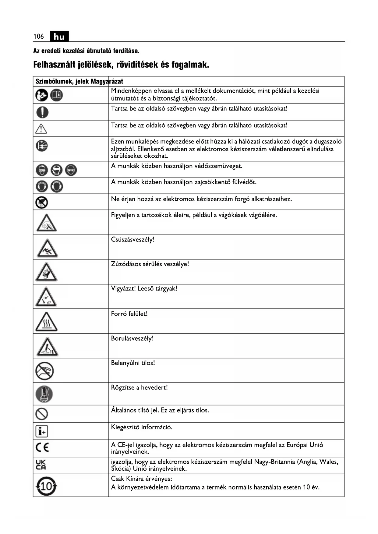Az eredeti kezelési útmutató fordítása. Felhasznált jelölések, rövidítések és fogalmak. Szimbólumok, jelek Magyarázat Mindenképpen olvassa el a mellékelt dokumentációt, mint például a kezelési útmutatót és a biztonsági tájékoztatót. Tartsa be az oldalsó szövegben vagy ábrán található utasításokat! Tartsa be az oldalsó szövegben vagy ábrán található utasításokat! Ezen munkalépés megkezdése előtt húzza ki a hálózati csatlakozó dugót a dugaszoló aljzatból. Ellenkező esetben az elektromos kéziszerszám véletlenszerű elindulása sérüléseket okozhat. A munkák közben használjon védőszemüveget. A munkák közben használjon zajcsökkentő fülvédőt. Ne érjen hozzá az elektromos kéziszerszám forgó alkatrészeihez. Figyeljen a tartozékok éleire, például a vágókések vágóélére. Csúszásveszély! Zúzódásos sérülés veszélye! Vigyázat! Leeső tárgyak! Forró felület! Borulásveszély! Belenyúlni tilos! Rögzítse a hevedert! Általános tiltó jel. Ez az eljárás tilos. Kiegészítő információ. A CE-jel igazolja, hogy az elektromos kéziszerszám megfelel az Európai Unió irányelveinek. igazolja, hogy az elektromos kéziszerszám megfelel Nagy-Britannia (Anglia, Wales, Skócia) Unió irányelveinek. Csak Kínára érvényes: A környezetvédelem időtartama a termék normális használata esetén 10 év.107