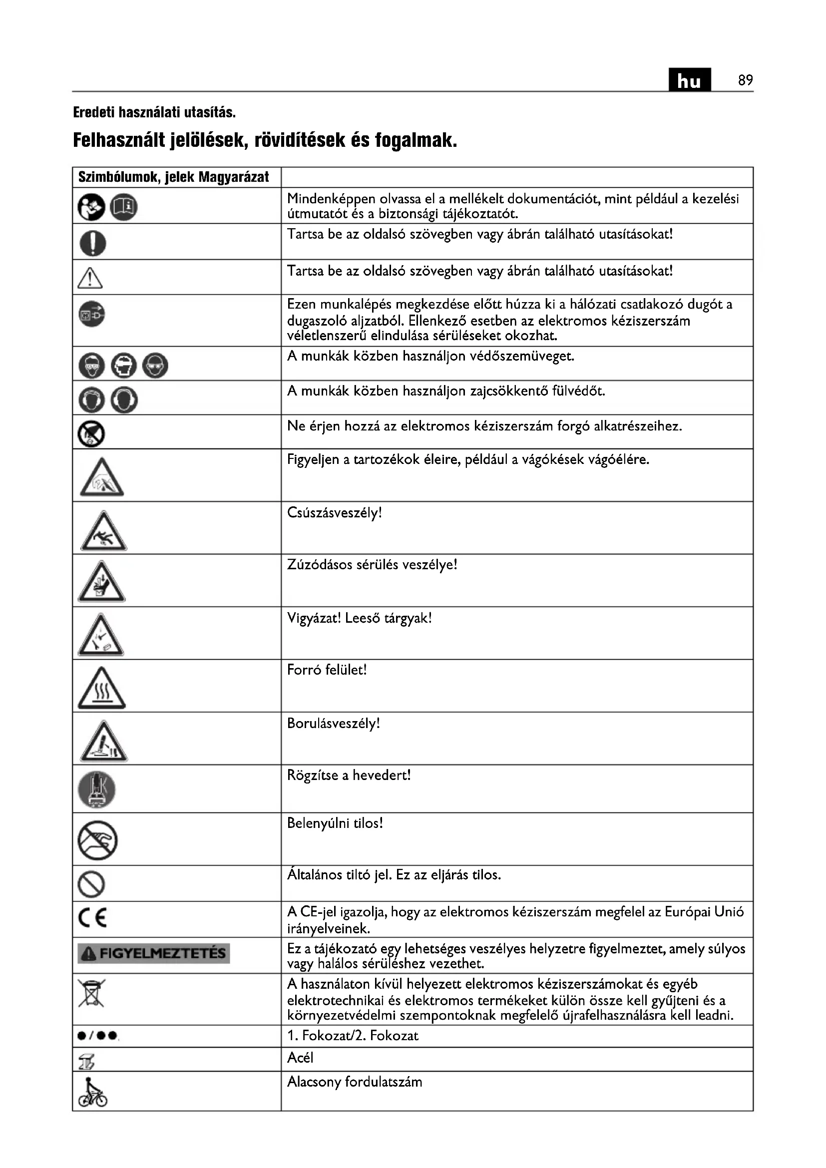 Eredeti használati utasítás. Felhasznált jelölések, rövidítések és fogalmak. Szimbólumok, jelek Magyarázat Mindenképpen olvassa el a mellékelt dokumentációt, mint például a kezelési útmutatót és a biztonsági tájékoztatót. Tartsa be az oldalsó szövegben vagy ábrán található utasításokat! Tartsa be az oldalsó szövegben vagy ábrán található utasításokat! Ezen munkalépés megkezdése előtt húzza ki a hálózati csatlakozó dugót a dugaszoló aljzatból. Ellenkező esetben az elektromos kéziszerszám véletlenszerű elindulása sérüléseket okozhat. A munkák közben használjon védőszemüveget. A munkák közben használjon zajcsökkentő fülvédőt. Ne érjen hozzá az elektromos kéziszerszám forgó alkatrészeihez. Figyeljen a tartozékok éleire, például a vágókések vágóélére. Csúszásveszély! Zúzódásos sérülés veszélye! Vigyázat! Leeső tárgyak! Forró felület! Borulásveszély! Rögzítse a hevedert! Belenyúlni tilos! Általános tiltó jel. Ez az eljárás tilos. A CE-jel igazolja, hogy az elektromos kéziszerszám megfelel az Európai Unió irányelveinek. Ez a tájékozató egy lehetséges veszélyes helyzetre figyelmeztet, amely súlyos vagy halálos sérüléshez vezethet. A használaton kívül helyezett elektromos kéziszerszámokat és egyéb elektrotechnikai és elektromos termékeket külön össze kell gyűjteni és a környezetvédelmi szempontoknak megfelelő újrafelhasználásra kell leadni.