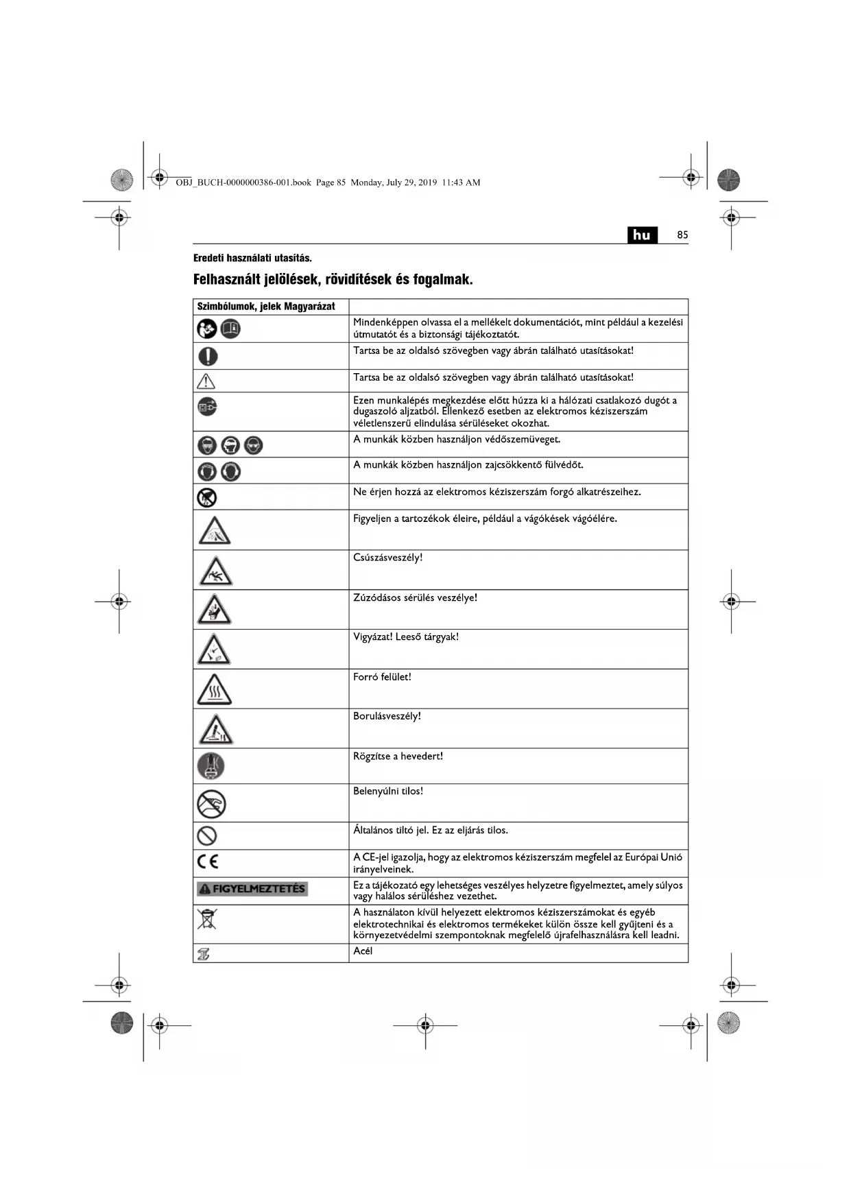 Eredeti használati utasítás. Felhasznált jelölések, rövidítések és fogalmak. Szimbólumok, jelek Magyarázat Mindenképpen olvassa el a mellékelt dokumentációt, mint például a kezelési útmutatót és a biztonsági tájékoztatót. Tartsa be az oldalsó szövegben vagy ábrán található utasításokat! Tartsa be az oldalsó szövegben vagy ábrán található utasításokat! Ezen munkalépés megkezdése előtt húzza ki a hálózati csatlakozó dugót a dugaszoló aljzatból. Ellenkező esetben az elektromos kéziszerszám véletlenszerű elindulása sérüléseket okozhat. A munkák közben használjon védőszemüveget. A munkák közben használjon zajcsökkentő fülvédőt. Ne érjen hozzá az elektromos kéziszerszám forgó alkatrészeihez. Figyeljen a tartozékok éleire, például a vágókések vágóélére. Csúszásveszély! Zúzódásos sérülés veszélye! Vigyázat! Leeső tárgyak! Forró felület! Borulásveszély! Rögzítse a hevedert! Belenyúlni tilos! Általános tiltó jel. Ez az eljárás tilos. A CE-jel igazolja, hogy az elektromos kéziszerszám megfelel az Európai Unió irányelveinek. Ez a tájékozató egy lehetséges veszélyes helyzetre figyelmeztet, amely súlyos vagy halálos sérüléshez vezethet. A használaton kívül helyezett elektromos kéziszerszámokat és egyéb elektrotechnikai és elektromos termékeket külön össze kell gyűjteni és a környezetvédelmi szempontoknak megfelelő újrafelhasználásra kell leadni. Acél OBJ_BUCH-0000000386-001.book Page 85 Monday, July 29, 2019 11:43 AM86