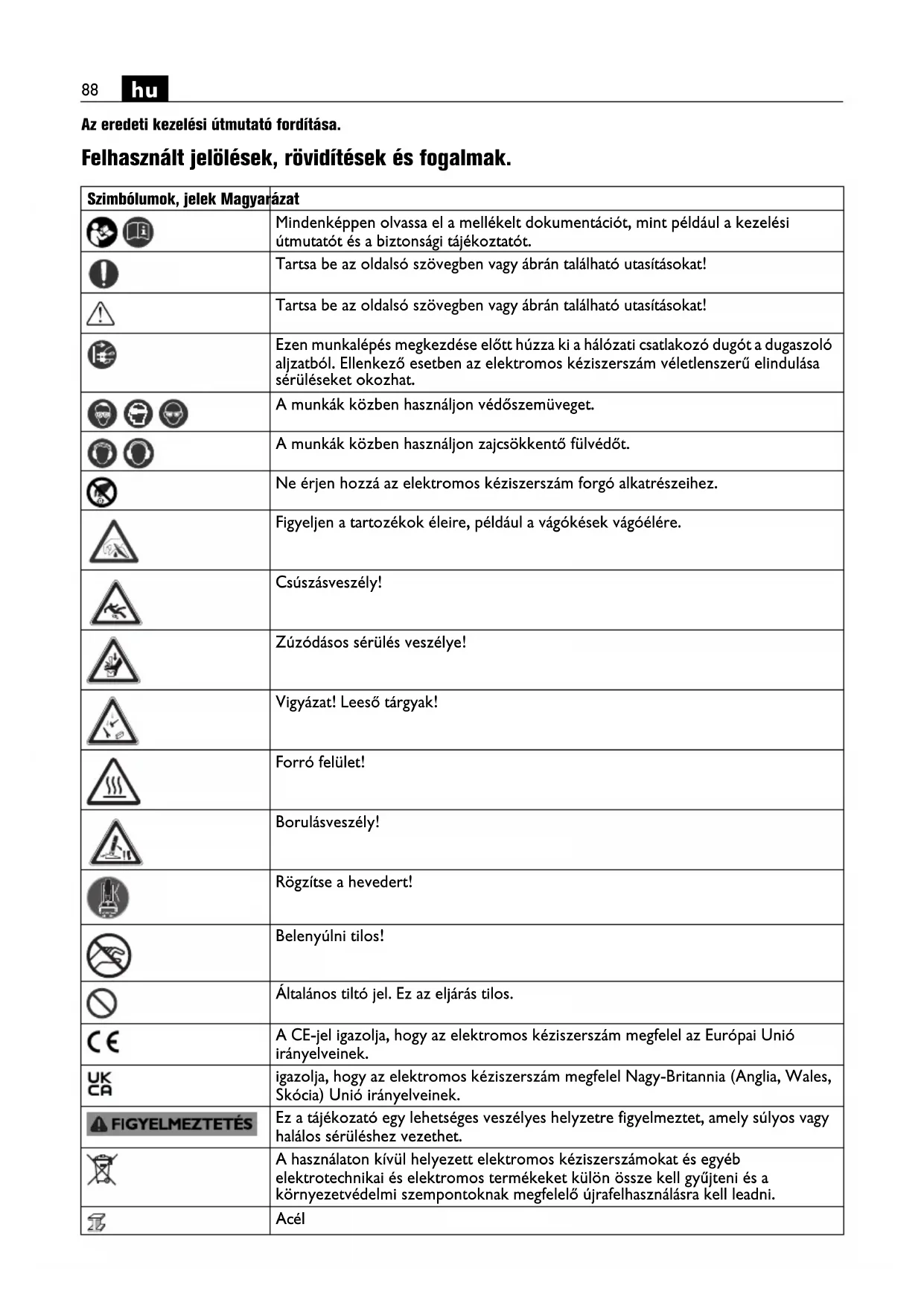 Az eredeti kezelési útmutató fordítása. Felhasznált jelölések, rövidítések és fogalmak. Szimbólumok, jelek Magyarázat Mindenképpen olvassa el a mellékelt dokumentációt, mint például a kezelési útmutatót és a biztonsági tájékoztatót. Tartsa be az oldalsó szövegben vagy ábrán található utasításokat! Tartsa be az oldalsó szövegben vagy ábrán található utasításokat! Ezen munkalépés megkezdése előtt húzza ki a hálózati csatlakozó dugót a dugaszoló aljzatból. Ellenkező esetben az elektromos kéziszerszám véletlenszerű elindulása sérüléseket okozhat. A munkák közben használjon védőszemüveget. A munkák közben használjon zajcsökkentő fülvédőt. Ne érjen hozzá az elektromos kéziszerszám forgó alkatrészeihez. Figyeljen a tartozékok éleire, például a vágókések vágóélére. Csúszásveszély! Zúzódásos sérülés veszélye! Vigyázat! Leeső tárgyak! Forró felület! Borulásveszély! Rögzítse a hevedert! Belenyúlni tilos! Általános tiltó jel. Ez az eljárás tilos. A CE-jel igazolja, hogy az elektromos kéziszerszám megfelel az Európai Unió irányelveinek. igazolja, hogy az elektromos kéziszerszám megfelel Nagy-Britannia (Anglia, Wales, Skócia) Unió irányelveinek. Ez a tájékozató egy lehetséges veszélyes helyzetre figyelmeztet, amely súlyos vagy halálos sérüléshez vezethet. A használaton kívül helyezett elektromos kéziszerszámokat és egyéb elektrotechnikai és elektromos termékeket külön össze kell gyűjteni és a környezetvédelmi szempontoknak megfelelő újrafelhasználásra kell leadni. Acél89