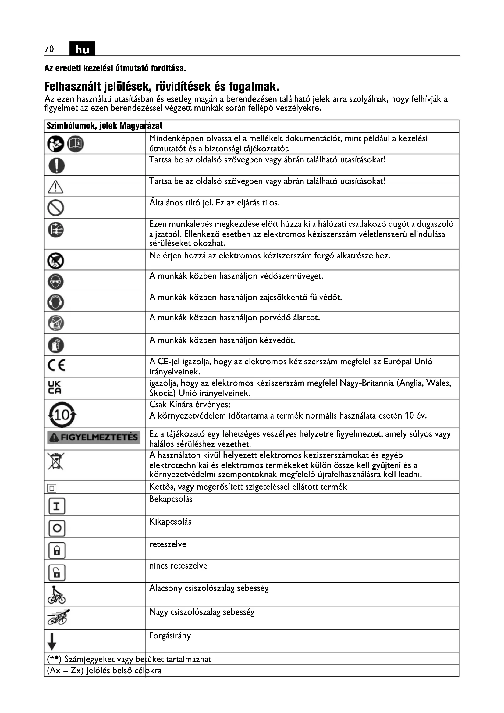 Az eredeti kezelési útmutató fordítása. Felhasznált jelölések, rövidítések és fogalmak. Az ezen használati utasításban és esetleg magán a berendezésen található jelek arra szolgálnak, hogy felhívják a figyelmét az ezen berendezéssel végzett munkák során fellépő veszélyekre. Szimbólumok, jelek Magyarázat Mindenképpen olvassa el a mellékelt dokumentációt, mint például a kezelési útmutatót és a biztonsági tájékoztatót. Tartsa be az oldalsó szövegben vagy ábrán található utasításokat! Tartsa be az oldalsó szövegben vagy ábrán található utasításokat! Általános tiltó jel. Ez az eljárás tilos. Ezen munkalépés megkezdése előtt húzza ki a hálózati csatlakozó dugót a dugaszoló aljzatból. Ellenkező esetben az elektromos kéziszerszám véletlenszerű elindulása sérüléseket okozhat. Ne érjen hozzá az elektromos kéziszerszám forgó alkatrészeihez. A munkák közben használjon védőszemüveget. A munkák közben használjon zajcsökkentő fülvédőt. A munkák közben használjon porvédő álarcot. A munkák közben használjon kézvédőt. A CE-jel igazolja, hogy az elektromos kéziszerszám megfelel az Európai Unió irányelveinek. igazolja, hogy az elektromos kéziszerszám megfelel Nagy-Britannia (Anglia, Wales, Skócia) Unió irányelveinek. Csak Kínára érvényes: A környezetvédelem időtartama a termék normális használata esetén 10 év. Ez a tájékozató egy lehetséges veszélyes helyzetre figyelmeztet, amely súlyos vagy halálos sérüléshez vezethet. A használaton kívül helyezett elektromos kéziszerszámokat és egyéb elektrotechnikai és elektromos termékeket külön össze kell gyűjteni és a környezetvédelmi szempontoknak megfelelő újrafelhasználásra kell leadni. Kettős, vagy megerősített szigeteléssel ellátott termék Bekapcsolás Kikapcsolás reteszelve nincs reteszelve Alacsony csiszolószalag sebesség Nagy csiszolószalag sebesség Forgásirány (**) Számjegyeket vagy betűket tartalmazhat (Ax – Zx) Jelölés belső célokra71