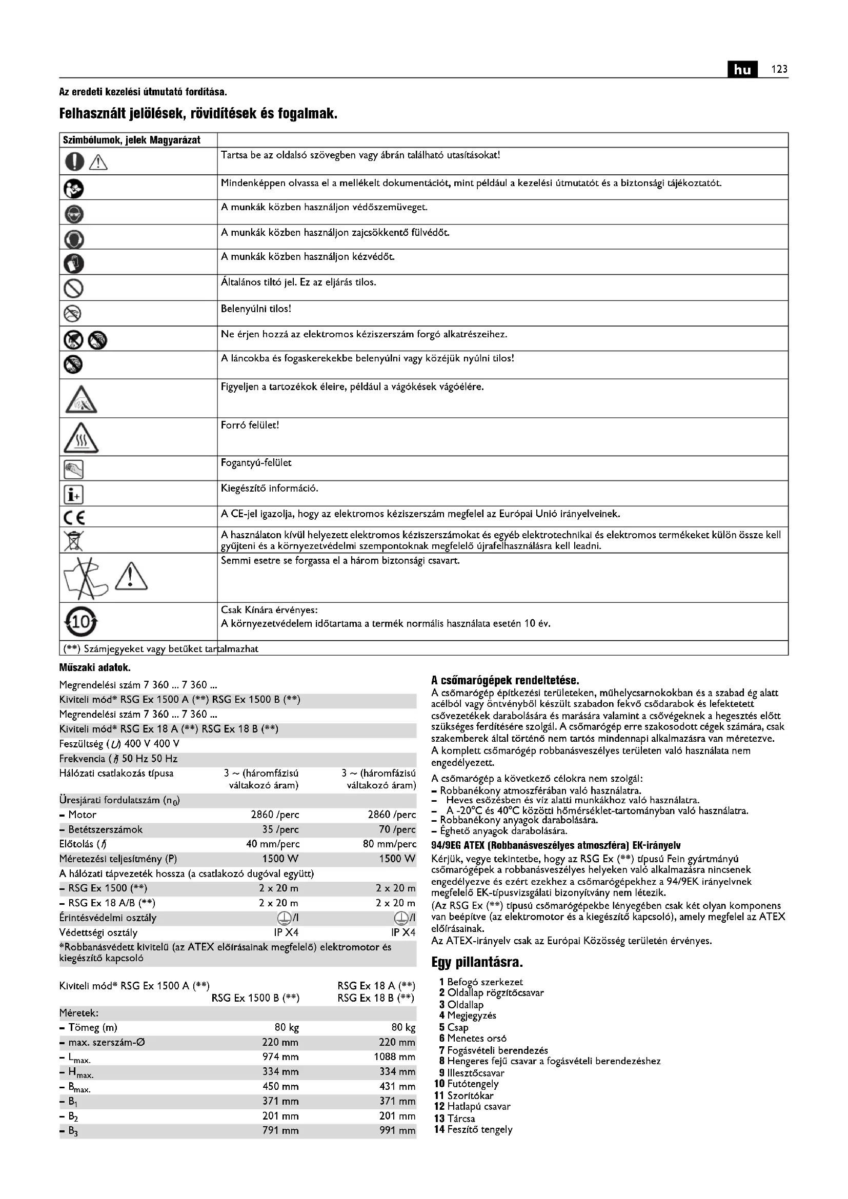 Kérjuk, vegye tekintetbe, hogy az RSG Ex (^**) tipusu Fein gyartmányu csomarogepek a robbanasysezelyes helyeken valo alkalmazsra nincsenek engedelyzeve es ezert ekehzakc s osmarogepekhez a 94/9EK iranyelvnek megfelel EK-tipusvizgalsati bizonyltvany nem letezik.