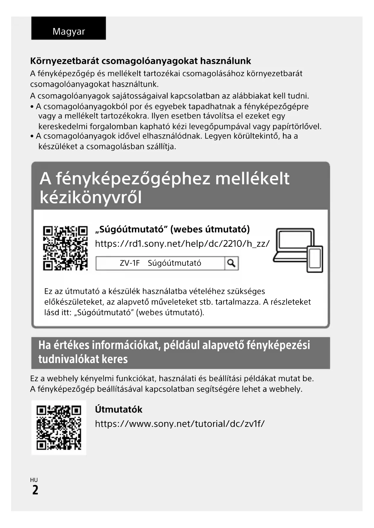 \\win-473\CAMERA\CX64700(YT)_SG\Multi\04_Compose\5041855311_17lang_STT\5041855311ZV1FCE3\10HU-ZV1FCE3\10HU.indd DTP data saved: 2022/07/06 14:10 PDF file created: 2022/07/06 14:11 Magyar Környezetbarát csomagolóanyagokat használunk A fényképezőgép és mellékelt tartozékai csomagolásához környezetbarát csomagolóanyagokat használtunk.A csomagolóanyagok sajátosságaival kapcsolatban az alábbiakat kell tudni.• A csomagolóanyagokból por és egyebek tapadhatnak a fényképezőgépre vagy a mellékelt tartozékokra. Ilyen esetben távolítsa el ezeket egy kereskedelmi forgalomban kapható kézi levegőpumpával vagy papírtörlővel.• A csomagolóanyagok idővel elhasználódnak. Legyen körültekintő, ha a készüléket a csomagolásban szállítja. A fényképezőgéphez mellékelt kézikönyvről https://rd1.sony.net/help/dc/2210/h_zz/ „Súgóútmutató” (webes útmutató) ZV-1F SúgóútmutatóEz az útmutató a készülék használatba vételéhez szükséges előkészületeket, az alapvető műveleteket stb. tartalmazza. A részleteket lásd itt: „Súgóútmutató” (webes útmutató). Ha értékes információkat, például alapvető fényképezési tudnivalókat keres Ez a webhely kényelmi funkciókat, használati és beállítási példákat mutat be.A fényképezőgép beállításával kapcsolatban segítségére lehet a webhely. https://www.sony.net/tutorial/dc/zv1f/ ÚtmutatókZV-1F5-041-855-31(1)
