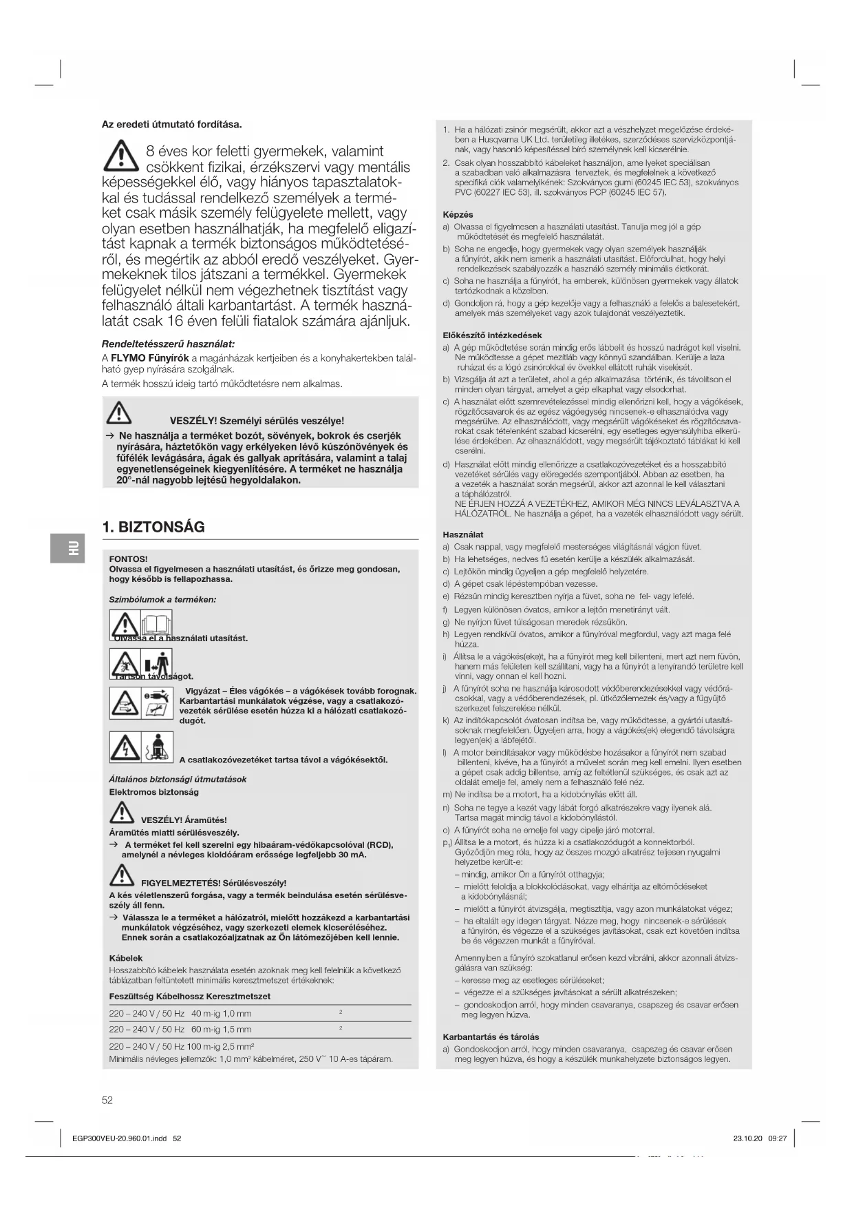 ) Állítsa le a motort, és húzza ki a csatlakozódugót a konnektorból. Győződjön meg róla, hogy az összes mozgó alkatrész teljesen nyugalmi helyzetbe került-e: – mindig, amikor Ön a fűnyírót otthagyja; – mielőtt feloldja a blokkolódásokat, vagy elhárítja az eltömődéseket a kidobónyílásnál; – mielőtt a fűnyírót átvizsgálja, megtisztítja, vagy azon munkálatokat végez; – ha eltalált egy idegen tárgyat. Nézze meg, hogy nincsenek-e sérülések a fűnyírón, és végezze el a szükséges javításokat, csak ezt követően indítsa be és végezzen munkát a fűnyíróval. Amennyiben a fűnyíró szokatlanul erősen kezd vibrálni, akkor azonnali átvizs- gálásra van szükség: – keresse meg az esetleges sérüléseket; – végezze el a szükséges javításokat a sérült alkatrészeken; – gondoskodjon arról, hogy minden csavaranya, csapszeg és csavar erősen meg legyen húzva. Karbantartás és tárolás a) Gondoskodjon arról, hogy minden csavaranya, csapszeg és csavar erősen meg legyen húzva, és hogy a készülék munkahelyzete biztonságos legyen. EGP300VEU-20.960.01.indd 52 23.10.20 09:27HU