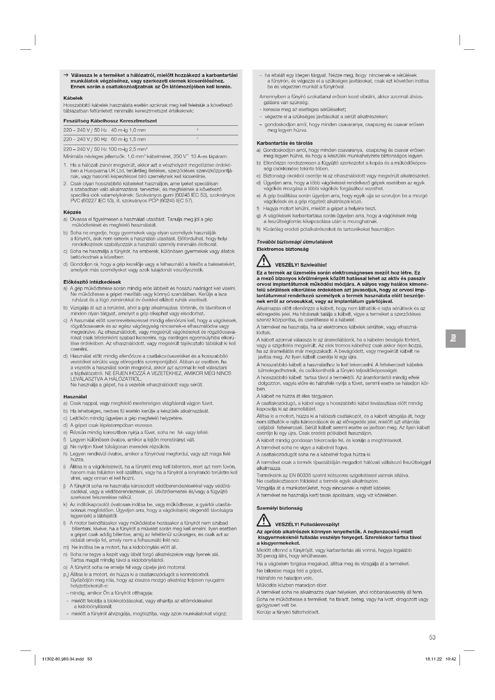 a szabadban való alkalmazásra terveztek, és megfelelnek a következő specifiká ciók valamelyikének: Szokványos gumi (60245 IEC 53), szokványos PVC (60227 IEC 53), ill. szokványos PCP (60245 IEC 57). Képzés a) Olvassa el figyelmesen a használati utasítást. Tanulja meg jól a gép működtetését és megfelelő használatát. b) Soha ne engedje, hogy gyermekek vagy olyan személyek használják a fűnyírót, akik nem ismerik a használati utasítást. Előfordulhat, hogy helyi rendelkezések szabályozzák a használó személy minimális életkorát. c) Soha ne használja a fűnyírót, ha emberek, különösen gyermekek vagy állatok tartózkodnak a közelben. d) Gondoljon rá, hogy a gép kezelője vagy a felhasználó a felelős a balesetekért, amelyek más személyeket vagy azok tulajdonát veszélyeztetik. Előkészítő intézkedések a) A gép működtetése során mindig erős lábbelit és hosszú nadrágot kell viselni. Ne működtesse a gépet mezítláb vagy könnyű szandálban. Kerülje a laza ruházat és a lógó zsinórokkal év övekkel ellátott ruhák viselését. b) Vizsgálja át azt a területet, ahol a gép alkalmazása történik, és távolítson el minden olyan tárgyat, amelyet a gép elkaphat vagy elsodorhat. c) A használat előtt szemrevételezéssel mindig ellenőrizni kell, hogy a vágókések, rögzítőcsavarok és az egész vágóegység nincsenek-e elhasználódva vagy megsérülve. Az elhasználódott, vagy megsérült vágókéseket és rögzítőcsava- rokat csak tételenként szabad kicserélni, egy esetleges egyensúlyhiba elkerü- lése érdekében. Az elhasználódott, vagy megsérült tájékoztató táblákat ki kell cserélni. d) Használat előtt mindig ellenőrizze a csatlakozóvezetéket és a hosszabbító vezetéket sérülés vagy elöregedés szempontjából. Abban az esetben, ha a vezeték a használat során megsérül, akkor azt azonnal le kell választani a táphálózatról. NE ÉRJEN HOZZÁ A VEZETÉKHEZ, AMIKOR MÉG NINCS LEVÁLASZTVA A HÁLÓZATRÓL. Ne használja a gépet, ha a vezeték elhasználódott vagy sérült. Használat a) Csak nappal, vagy megfelelő mesterséges világításnál vágjon füvet. b) Ha lehetséges, nedves fű esetén kerülje a készülék alkalmazását. c) Lejtőkön mindig ügyeljen a gép megfelelő helyzetére. d) A gépet csak lépéstempóban vezesse. e) Rézsűn mindig keresztben nyírja a füvet, soha ne fel- vagy lefelé. f) Legyen különösen óvatos, amikor a lejtőn menetirányt vált. g) Ne nyírjon füvet túlságosan meredek rézsűkön. h) Legyen rendkívül óvatos, amikor a fűnyíróval megfordul, vagy azt maga felé húzza.