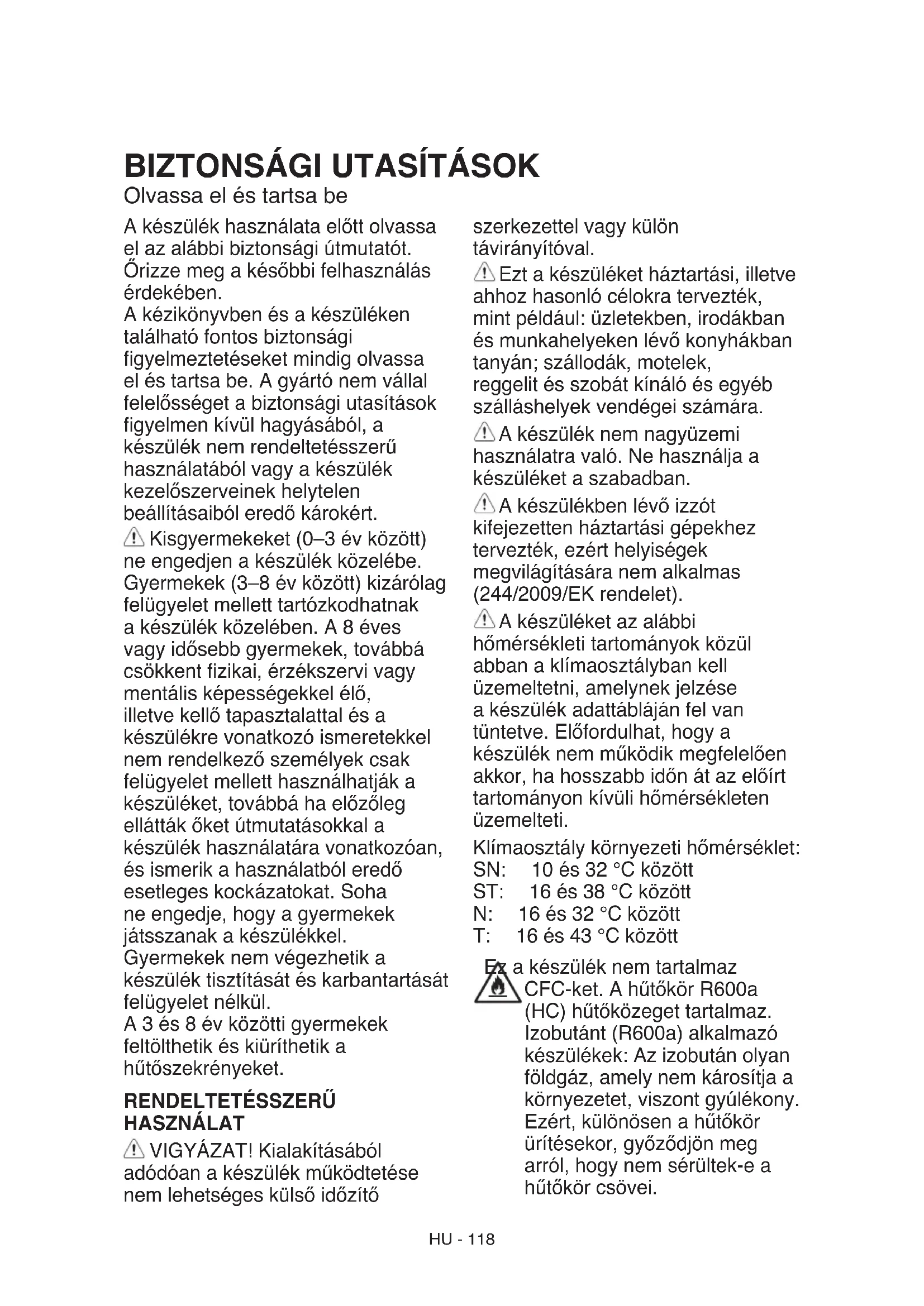Olvassaeléstartsabe Akészülékhasználataelőttolvassa elazalábbibiztonságiútmutatót. Őrizzemegakésőbbifelhasználás érdekében. Akézikönyvbenésakészüléken találhatófontosbiztonsági gyelmeztetéseketmindigolvassa eléstartsabe.Agyártónemvállal felelősségetabiztonságiutasítások gyelmenkívülhagyásából,a készüléknemrendeltetésszerű használatábólvagyakészülék kezelőszerveinekhelytelen beállításaibóleredőkárokért. Kisgyermekeket(0–3évközött) neengedjenakészülékközelébe. Gyermekek(3–8évközött)kizárólag felügyeletmelletttartózkodhatnak akészülékközelében.A8éves vagyidősebbgyermekek,továbbá csökkentzikai,érzékszervivagy mentálisképességekkelélő, illetvekellőtapasztalattalésa készülékrevonatkozóismeretekkel nemrendelkezőszemélyekcsak felügyeletmelletthasználhatjáka készüléket,továbbáhaelőzőleg elláttákőketútmutatásokkala készülékhasználatáravonatkozóan, ésismerikahasználatbóleredő esetlegeskockázatokat.Soha neengedje,hogyagyermekek játsszanakakészülékkel. Gyermekeknemvégezhetika készüléktisztításátéskarbantartását felügyeletnélkül. A3és8évközöttigyermekek feltölthetikéskiüríthetika hűtőszekrényeket. RENDELTETÉSSZERŰ HASZNÁLAT VIGYÁZAT!Kialakításából adódóanakészülékműködtetése nemlehetségeskülsőidőzítő szerkezettelvagykülön távirányítóval. Eztakészüléketháztartási,illetve ahhozhasonlócélokratervezték, mintpéldául:üzletekben,irodákban ésmunkahelyekenlévőkonyhákban tanyán;szállodák,motelek, reggelitésszobátkínálóésegyéb szálláshelyekvendégeiszámára. Akészüléknemnagyüzemi használatravaló.Nehasználjaa készüléketaszabadban. Akészülékbenlévőizzót kifejezettenháztartásigépekhez tervezték,ezérthelyiségek megvilágításáranemalkalmas (244/2009/EKrendelet). Akészüléketazalábbi hőmérsékletitartományokközül abbanaklímaosztálybankell üzemeltetni,amelynekjelzése akészülékadattáblájánfelvan tüntetve.Előfordulhat,hogya készüléknemműködikmegfelelően akkor,hahosszabbidőnátazelőírt tartományonkívülihőmérsékleten üzemelteti. Klímaosztálykörnyezetihőmérséklet: SN: 10és32°Cközött ST: 16és38°Cközött N: 16és32°Cközött T: 16és43°Cközött Ezakészüléknemtartalmaz CFC-ket.AhűtőkörR600a (HC)hűtőközegettartalmaz. Izobutánt(R600a)alkalmazó készülékek:Azizobutánolyan földgáz,amelynemkárosítjaa környezetet,viszontgyúlékony. Ezért,különösenahűtőkör ürítésekor,győződjönmeg arról,hogynemsérültek-ea hűtőkörcsövei.HU-119 VIGYÁZAT!Tilosakészülék hűtőkörénekcsöveitmegrongálni. VIGYÁZAT!Hagyjaszabadon akészülékházánésabeépített részekenlévőnyílásokat. VIGYÁZAT!Aleolvasztás felgyorsításaérdekébenkizárólag agyártóajánlásaitkövesse,ésne alkalmazzonegyébmechanikus, elektromosvagyvegyimódszereket. VIGYÁZAT!Netegyen akészülékbeagyártóáltal ajánlottaktóleltérőtípusúelektromos berendezéseket,illetvene használjonilyeneket. VIGYÁZAT!Avízhálózatba közvetlenülnembekötött jégkockakészítőketés/vagy vízadagolókatkizárólagivóvízzel szabadfeltölteni. VIGYÁZAT!Azautomata jégkockakészítőtés/vagyvízadagolót kizárólagolyanivóvízhálózatra szabadcsatlakoztatni,amelynek nyomásaa0,17és0,81MPa(1,7és 8,1bar)közöttitartománybaesik. Netároljonrobbanásveszélyes anyagokat(pl.aeroszolosakont)a készülékbenvagyannakközelében. Netegyenbenzintvagyegyéb gyúlékonyanyagotakészülékbe vagyannakközelébe,illetvene használjonhasonlókatakészülékben vagyannakközelében. Nenyeljeleajégakkubanlévő (nemmérgező)folyadékot(haa készülékjégakkuvalrendelkezik). Miutánajégkockákatvagya jégkrémetkivetteakészülékből,ne fogyasszaelazonnal,mertfagyási sérüléseketszenvedhet. Haakészülékventilátorának burkolataalattlevegőszűrőtalálható, aszűrőnekakészülékhasználata közbenmindigahelyénkelllennie. Afagyasztótérbennetároljon folyadékotüvegedényekben,mertaz edényekszéttörhetnek. Aventilátort(havan)netakarjael élelmiszerekkel. Azélelmiszerekbehelyezése utángyőződjönmegarról,hogya hűtőszekrényajtajai–különösena fagyasztóajtaja–megfelelőenbe vannakzárva. Asérülttömítéseketalehető leghamarabbkikellcserélni. Ahűtőteretkizárólagfriss élelmiszerektárolására, afagyasztóteretpedig mélyhűtöttételektárolására, frissételeklefagyasztásáraés jégkockakészítésrehasználja. Anemcsomagoltélelmiszereket úgyhelyezzeel,hogyazokne érjenekhozzáahűtőtér/fagyasztótér falához. Akészülékekspeciálisrekeszekkel vannakkialakítva(pl.friss élelmiszerekettárolórekesz,zéró hőmérsékletűrekeszstb.). Haakészülékhezkapotttájékoztató máskéntnemrendelkezik,a rekeszekeltávolíthatókanélkül,hogy ateljesítménycsökkenne. AC-pentánegygyúlékonygáz, amelyethabosítóanyagként használnakaszigetelőhabhoz. Akészüléklegalkalmasabbrekeszei, amelyekbenbizonyosételtípusok tárolhatók,gyelembevévea készülékkülönbözőrekeszeinek eltérőhőeloszlását,akövetkezők: -Hűtőtér: 1)Ahűtőtérfelsőrésze&ajtó- temperáltzóna:Déligyümölcs, konzerv,italok,tojás,szósz, savanyúság,vaj,lekvártárolásához ajánlott 2)Ahűtőtérközépsőrésze-HU-120 hűvöszóna:Sajt,tej,tejtermékek, csemegeáruk,joghurttárolásához ajánlott 3)Ahűtőtéralsórésze-leghidegebb zóna:Felvágottak,desszertek, húséshal,sajttorta,frisstészta, tejföl,pesto/salsa,házilagkészített szendvicskrémek,süteménykrém, pudingéskrémsajttárolásához ajánlott 4)Gyümölcs&zöldségóka hűtőtéralsórészén:Zöldségekés gyümölcsök(kivévedéligyümölcsök) tárolásáhozajánlott 5)Sokkolórekesz:Aleghidegebb ókbancsakhústéshalattároljon -Fagyasztótér: Anégycsillagoszóna(****)rekesz szobahőmérsékletűélelmiszerek lefagyasztásáraésfagya