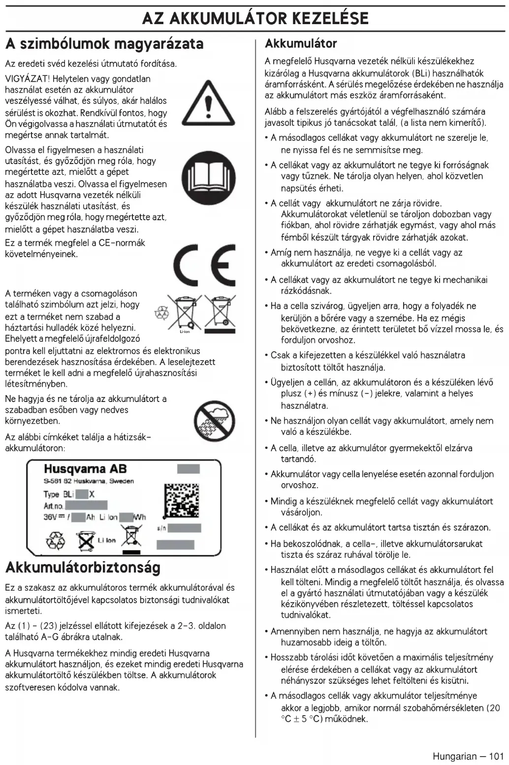 Hungarian – 101 A szimbólumok magyarázata Az eredeti svéd kezelési útmutató fordítása. VIGYÁZAT! Helytelen vagy gondatlan használat esetén az akkumulátor veszélyessé válhat, és súlyos, akár halálos sérülést is okozhat. Rendkívül fontos, hogy Ön végigolvassa a használati útmutatót és megértse annak tartalmát. Olvassa el figyelmesen a használati utasítást, és gyŒzŒdjön meg róla, hogy megértette azt, mielŒtt a gépet használatba veszi. Olvassa el figyelmesen az adott Husqvarna vezeték nélküli készülék használati utasítást, és gyŒzŒdjön meg róla, hogy megértette azt, mielŒtt a gépet használatba veszi. Ez a termék megfelel a CE-normák követelményeinek. A terméken vagy a csomagoláson található szimbólum azt jelzi, hogy ezt a terméket nem szabad a háztartási hulladék közé helyezni. Ehelyett a megfelelŒ újrafeldolgozó pontra kell eljuttatni az elektromos és elektronikus berendezések hasznosítása érdekében. A leselejtezett terméket le kell adni a megfelelŒ újrahasznosítási létesítményben. Ne hagyja és ne tárolja az akkumulátort a szabadban esŒben vagy nedves környezetben. Az alábbi címkéket találja a hátizsák- akkumulátoron: Akkumulátorbiztonság Ez a szakasz az akkumulátoros termék akkumulátorával és akkumulátortöltŒjével kapcsolatos biztonsági tudnivalókat ismerteti. Az (1) - (23) jelzéssel ellátott kifejezések a 2-3. oldalon található A-G ábrákra utalnak. A Husqvarna termékekhez mindig eredeti Husqvarna akkumulátort használjon, és ezeket mindig eredeti Husqvarna akkumulátortöltŒ készülékben töltse. A akkumulátorok szoftveresen kódolva vannak. Akkumulátor A megfelelŒ Husqvarna vezeték nélküli készülékekhez kizárólag a Husqvarna akkumulátorok (BLi) használhatók áramforrásként. A sérülés megelŒzése érdekében ne használja az akkumulátort más eszköz áramforrásaként. Alább a felszerelés gyártójától a végfelhasználó számára javasolt tipikus jó tanácsokat talál, (a lista nem kimerítŒ).