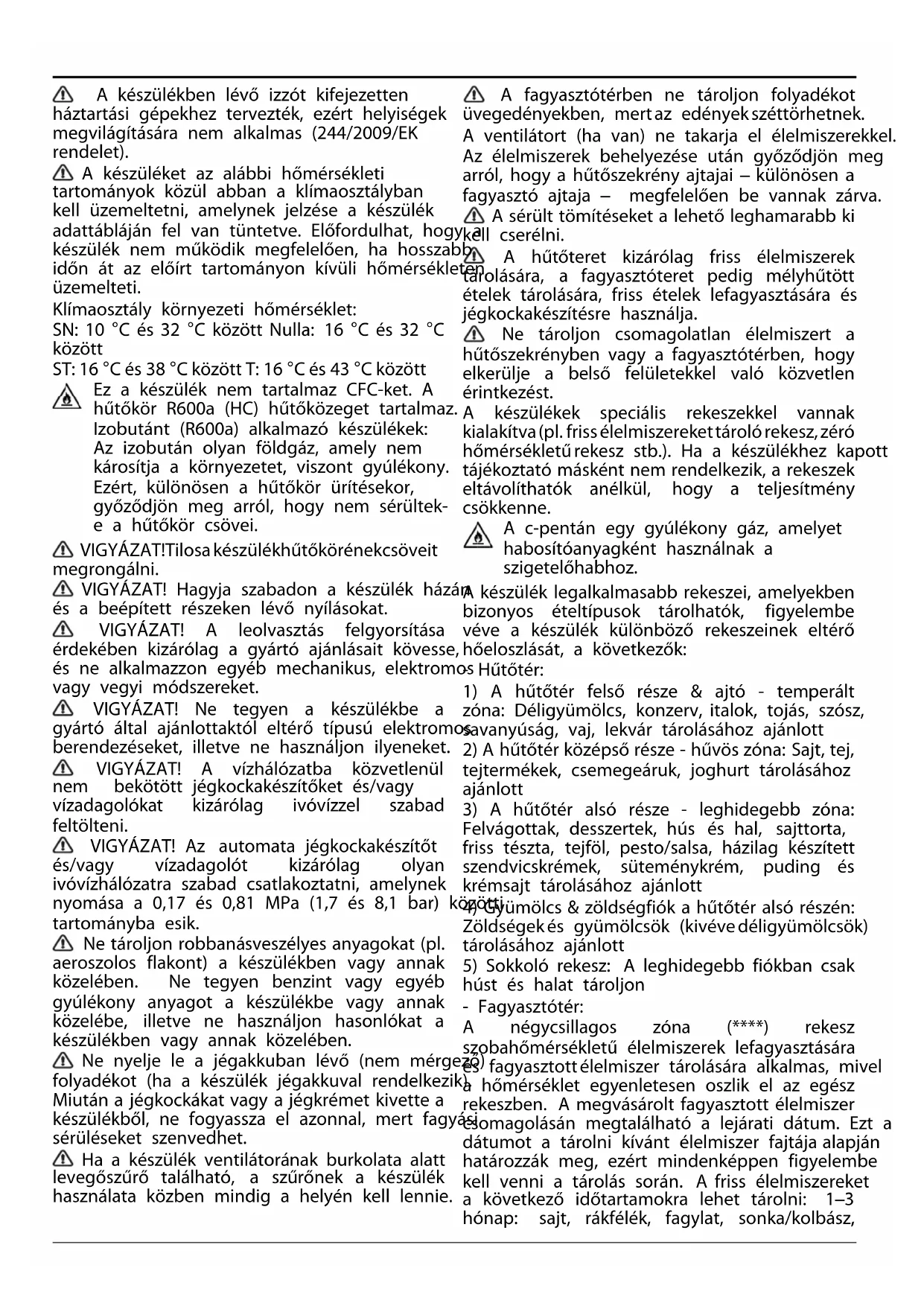FIGYELEM: Kialakításából adódóan a készülék működtetése nem lehetséges külső időzítő szerkezettel vagy külön távirányítóval. Eztakészüléketháztartásiilletveahhozhasonló célokra tervezték, mint például: üzletekben, irodákban lévő és egyéb munkahelyi konyhákban; tanyán; szállodák, motelek, reggelit és szobát kínáló és egyéb szálláshelyek vendégei számára. A készüléket nem nagyüzemi használatra tervezték. Ne használja a készüléket a szabadban.A készülékben lévő izzót kifejezetten háztartási gépekhez tervezték, ezért helyiségek megvilágítására nem alkalmas (244/2009/EK rendelet). A készüléket az alábbi hőmérsékleti tartományok közül abban a klímaosztályban kell üzemeltetni, amelynek jelzése a készülék adattábláján fel van tüntetve. Előfordulhat, hogy a készülék nem működik megfelelően, ha hosszabb időn át az előírt tartományon kívüli hőmérsékleten üzemelteti. Klímaosztály környezeti hőmérséklet: SN: 10 °C és 32 °C között Nulla: 16 °C és 32 °C között ST: 16 °C és 38 °C között T: 16 °C és 43 °C között Ez a készülék nem tartalmaz CFC-ket. A hűtőkör R600a (HC) hűtőközeget tartalmaz. Izobutánt (R600a) alkalmazó készülékek: Az izobután olyan földgáz, amely nem károsítja a környezetet, viszont gyúlékony. Ezért, különösen a hűtőkör ürítésekor, győződjön meg arról, hogy nem sérültek- e a hűtőkör csövei. VIGYÁZAT!Tilosakészülékhűtőkörénekcsöveit megrongálni. VIGYÁZAT! Hagyja szabadon a készülék házán és a beépített részeken lévő nyílásokat. VIGYÁZAT! A leolvasztás felgyorsítása érdekében kizárólag a gyártó ajánlásait kövesse, és ne alkalmazzon egyéb mechanikus, elektromos vagy vegyi módszereket. VIGYÁZAT! Ne tegyen a készülékbe a gyártó által ajánlottaktól eltérő típusú elektromos berendezéseket, illetve ne használjon ilyeneket. VIGYÁZAT! A vízhálózatba közvetlenül nem bekötött jégkockakészítőket és/vagy vízadagolókat kizárólag ivóvízzel szabad feltölteni. VIGYÁZAT! Az automata jégkockakészítőt és/vagy vízadagolót kizárólag olyan ivóvízhálózatra szabad csatlakoztatni, amelynek nyomása a 0,17 és 0,81 MPa (1,7 és 8,1 bar) közötti tartományba esik. Ne tároljon robbanásveszélyes anyagokat (pl. aeroszolos flakont) a készülékben vagy annak közelében. Ne tegyen benzint vagy egyéb gyúlékony anyagot a készülékbe vagy annak közelébe, illetve ne használjon hasonlókat a készülékben vagy annak közelében. Ne nyelje le a jégakkuban lévő (nem mérgező) folyadékot (ha a készülék jégakkuval rendelkezik). Miután a jégkockákat vagy a jégkrémet kivette a készülékből, ne fogyassza el azonnal, mert fagyási sérüléseket szenvedhet. Ha a készülék ventilátorának burkolata alatt levegőszűrő található, a szűrőnek a készülék használata közben mindig a helyén kell lennie. A fagyasztótérben ne tároljon folyadékot üvegedényekben, mertaz edényekszéttörhetnek. A ventilátort (ha van) ne takarja el élelmiszerekkel. Az élelmiszerek behelyezése után győződjön meg arról, hogy a hűtőszekrény ajtajai – különösen a fagyasztó ajtaja – megfelelően be vannak zárva. A sérült tömítéseket a lehető leghamarabb ki kell cserélni. A hűtőteret kizárólag friss élelmiszerek tárolására, a fagyasztóteret pedig mélyhűtött ételek tárolására, friss ételek lefagyasztására és jégkockakészítésre használja. Ne tároljon csomagolatlan élelmiszert a hűtőszekrényben vagy a fagyasztótérben, hogy elkerülje a belső felületekkel való közvetlen érintkezést. A készülékek speciális rekeszekkel vannak kialakítva(pl. frissélelmiszerekettárolórekesz,zéró hőmérsékletűrekesz stb.). Ha a készülékhez kapott tájékoztató másként nem rendelkezik, a rekeszek eltávolíthatók anélkül, hogy a teljesítmény csökkenne. A c-pentán egy gyúlékony gáz, amelyet habosítóanyagként használnak a szigetelőhabhoz. A készülék legalkalmasabb rekeszei, amelyekben bizonyos ételtípusok tárolhatók, figyelembe véve a készülék különböző rekeszeinek eltérő hőeloszlását, a következők: - Hűtőtér: