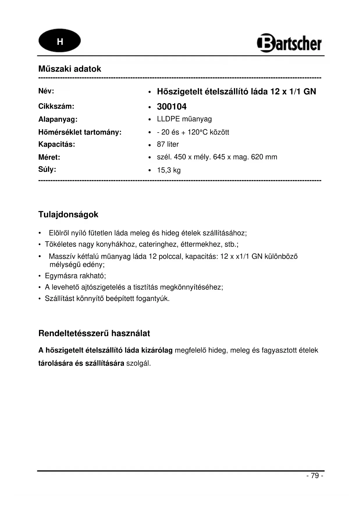 Rendeltetésszerű használat A hőszigetelt ételszállító láda kizárólag megfelelő hideg, meleg és fagyasztott ételek tárolására és szállítására szolgál. H- 80 - Leírás