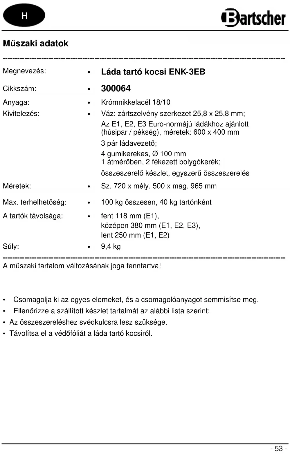 AK300 - Görgős kocsi BARTSCHER - Ingyenes használati útmutató