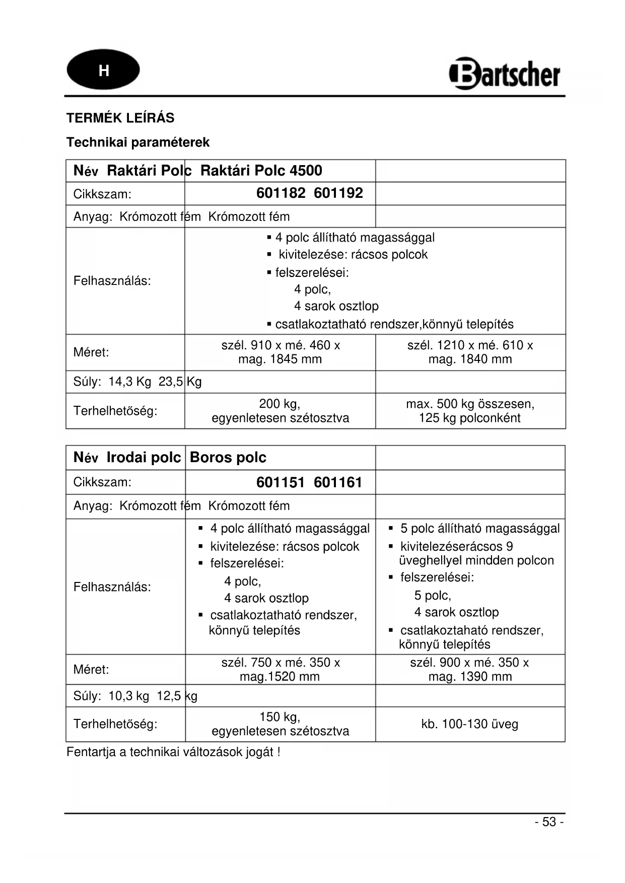 kivitelezéserácsos 9 üveghellyel mindden polcon felszerelései: 5 polc, 4 sarok osztlop csatlakoztaható rendszer, könnyű telepítés Méret: szél. 750 x mé. 350 x mag.1520 mm szél. 900 x mé. 350 x mag. 1390 mm Súly: 10,3 kg 12,5 kg Terhelhetőség: 150 kg, egyenletesen szétosztva kb. 100-130 üveg Fentartja a technikai változások jogát ! H- 54 - Alkatrész Lista / Szállítási csomag részei