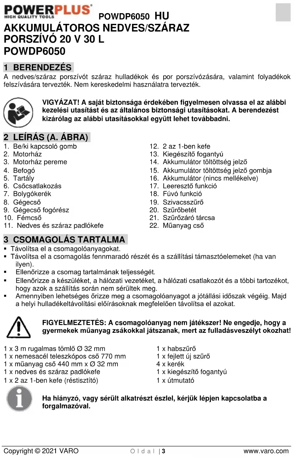 - Ne a kábelt használja az eszköz szállításához vagy felakasztásához, és a csatlakozót ne a kábel meghúzásával távolítsa el a tápaljzatból. A tápkábelt tartsa távol hőtől, olajtól, élesPOWDP6050 HU Copyright © 2021 VARO O l d a l | 5 www.varo.com élektől vagy az eszköz mozgó alkatrészeitől. A sérült vagy összegubancolódott tápkábelek növelik az áramütés kockázatát.